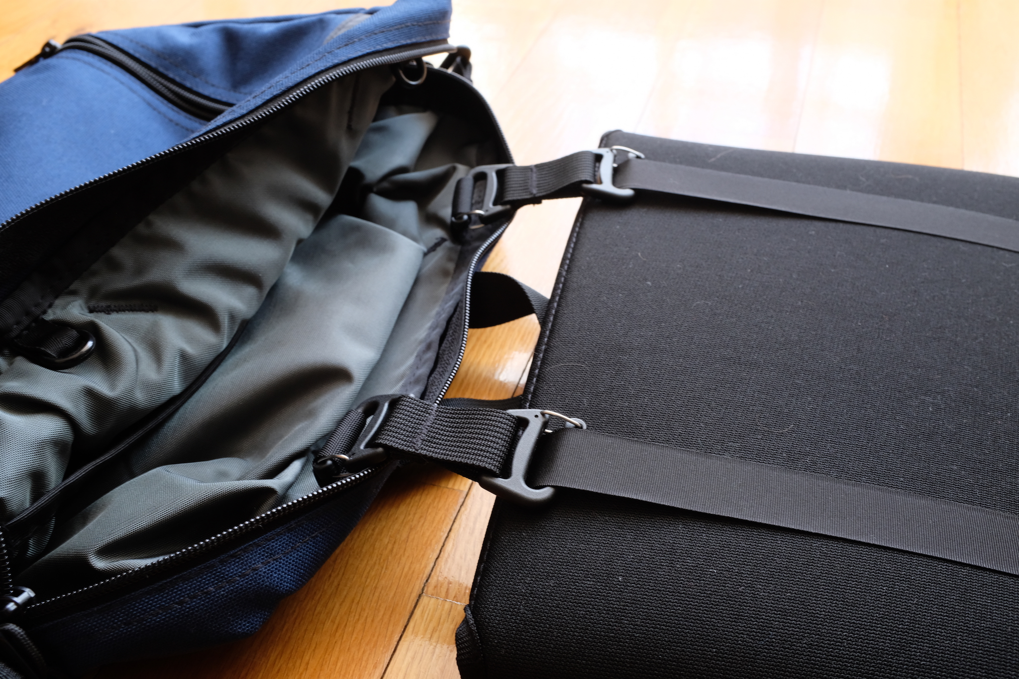 You're free to use this system or just throw your sleeve into your bag. However it's advised to use the rails system as it's really designed in a thoughtful way. So what is the rails system? When you buy the Cache laptop sleeve from TB, you'll find **two parallel nylon webbing loops **which extends from the bottom to the top. In your Tom Bihn bag (say our Daylight Briefcase which we review now), you'll find two clips that you can attach to these loops.