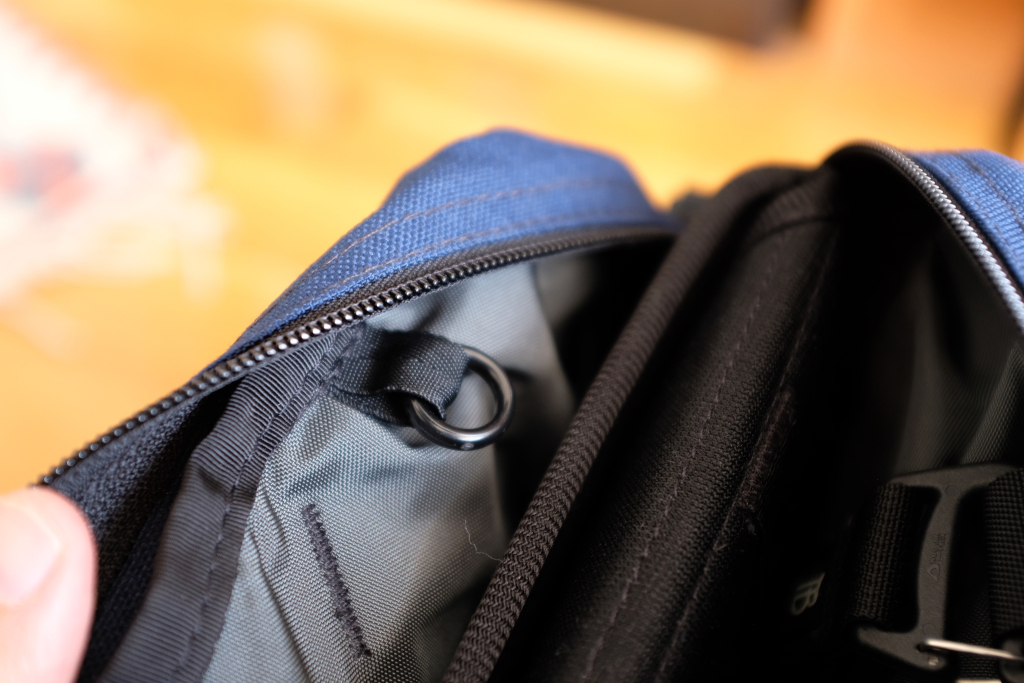 The Cache system is not the only organization system built into TB bags. There is also the O-ring system. This system allows you to attach small little pouches, cubes, straps, etc., into plastic rings sewn inside the pockets and compartments of a Tom Bihn bag.