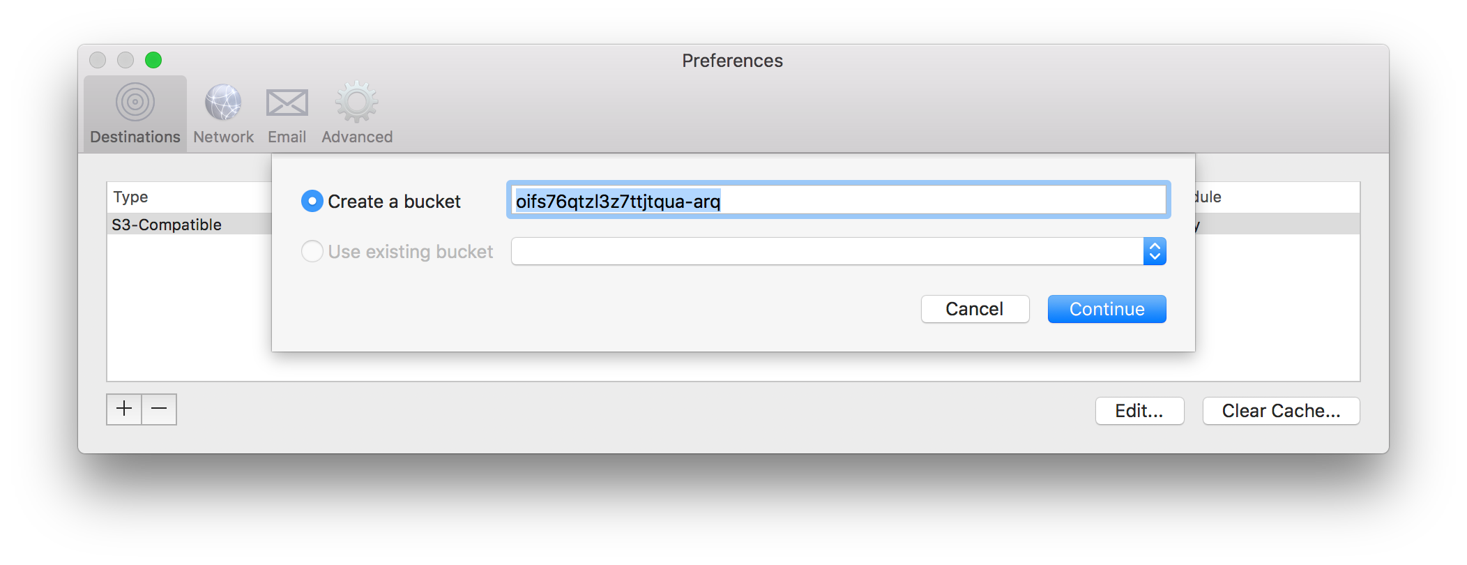 Once you click Continue, Arq will suggest a new, unique name to store your data. You can leave this or use a custom name.
