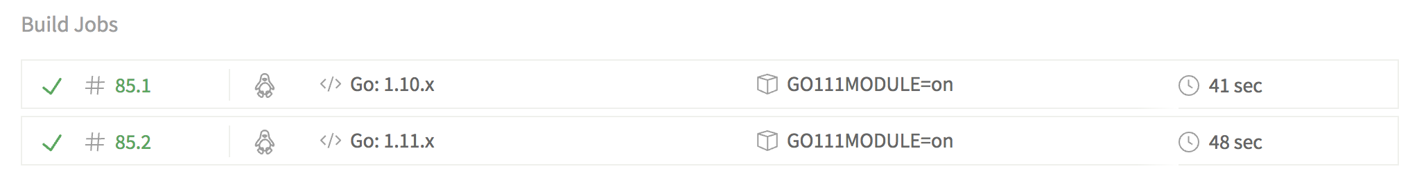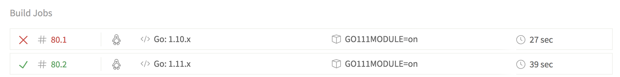 We have now a CI system that tests our Go package against two different Go versions. This will help us to make sure our code still works for older versions of Go and newer versions that use Go modules.