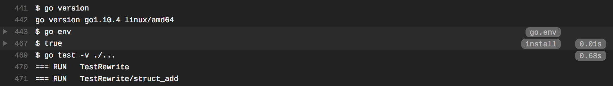 Travis always triggers two builds for each listed Go version. Now what we have to do is, to change the script directive for each of these versions. This was implicit. Just like we did with install and script, we're going to replace the go directive and change it explicitly: