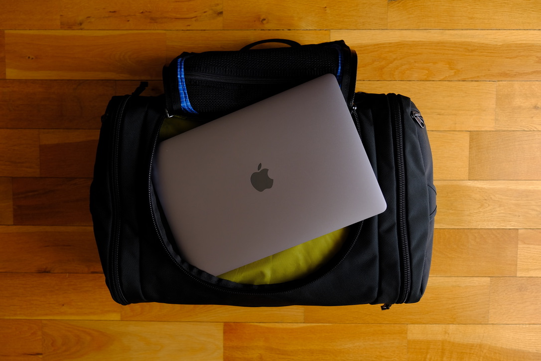 The main compartment, compared to traditional duffels, is accessed through a curved zipper, which is not under the carry handle. It is used to place your main items, especially clothes. It's wide enough to accommodate a 13" inch MacBook (more on this later).
