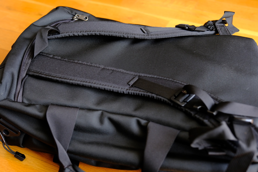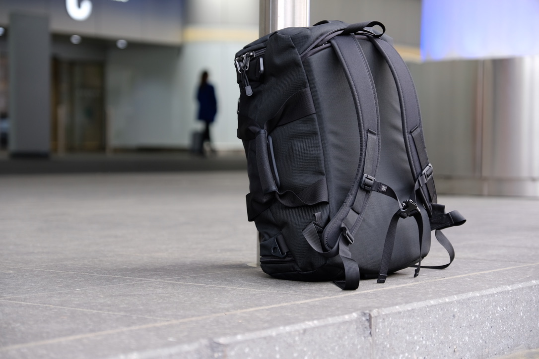 With its zip-away backpack strap, the Aeronaut 30 can be carried as a backpack as well. The backpack straps are hidden behind a zipper compartment. You unzip and take out the straps and attach them to the buckles on the bottom of the bag.