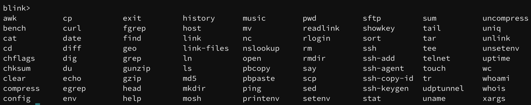The first thing I started doing was to install Blink.sh and experimenting with it. Blink.sh is a Terminal Emulator and has sandboxed local terminal access, which you can use for basic stuff. It includes the following commands: