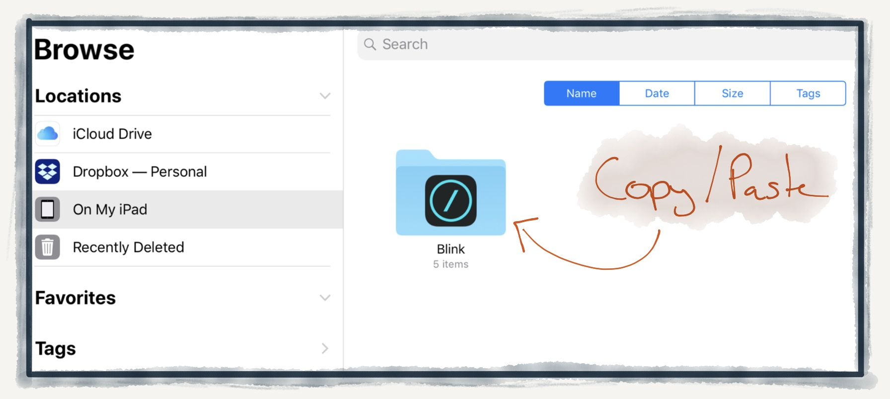 scpfrom within Blink.sh app. Blink has local storage, that you can use to copy files from your host or retrieve them withscp. The Files app has a Blink folder that allows you to copy/past any files into. So this means once a file is inside the Files App, you can theoretically copy anything to your remote host. Once you put a file inside the Blink folder, all you do is to call the following command (hostname is the name you define in Blink.sh):