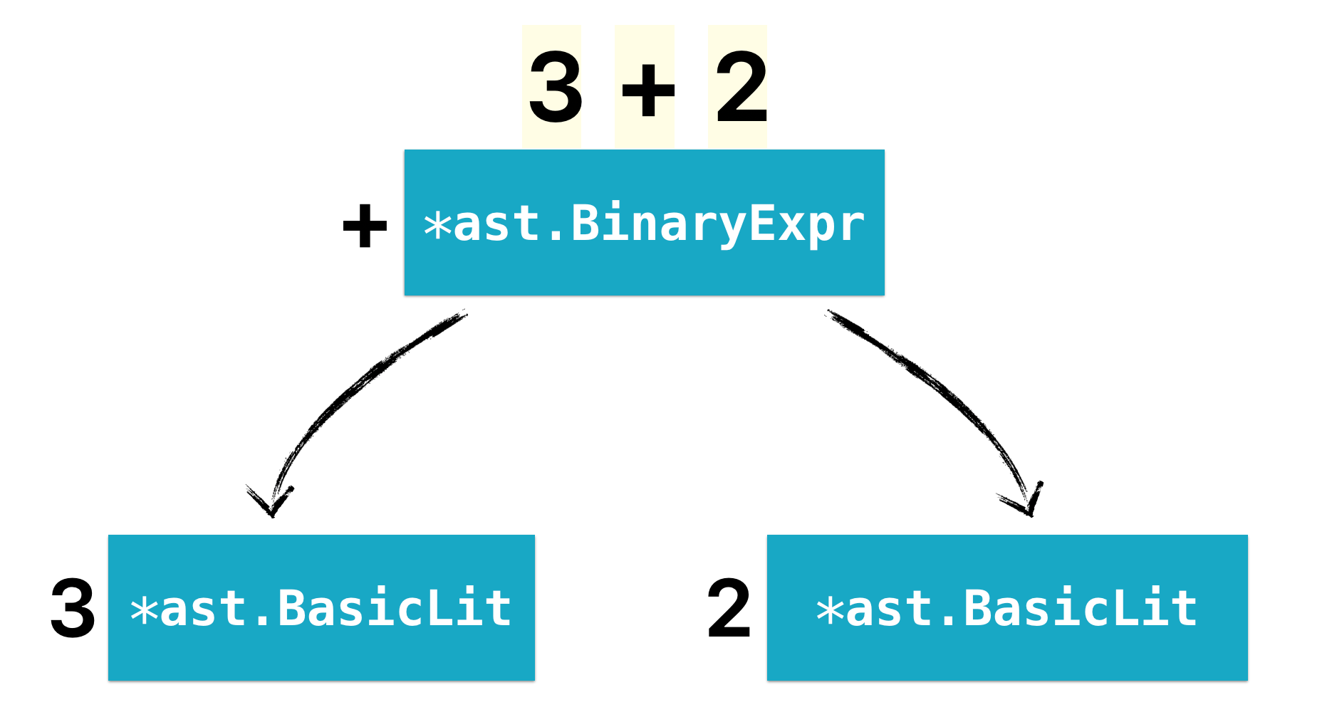 We need to understand first what 3 + 2 means. This is a binary expression in Go. A binary expression can be represented by the AST node type *ast.BinaryExpr. For example, a simple 3 + 2 binary expression can be written as: