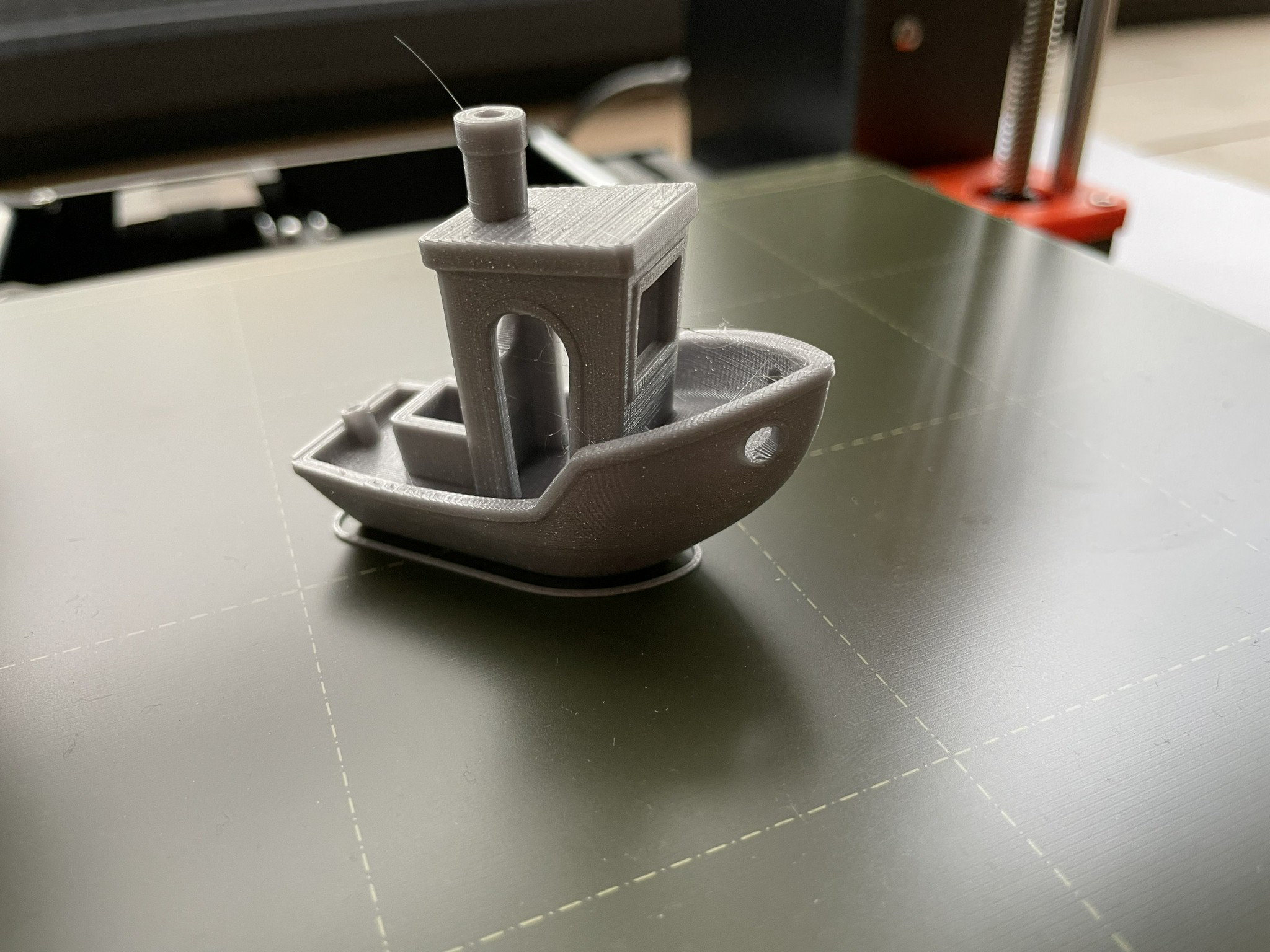 Before the first print, you do a Z-calibration test called the First Layer Calibration. It's used to calibrate the distance between the tip of the nozzle and the print surface. That takes a couple of iterations until a particular pattern is neatly printed on the sheet. After that, you can print small objects, like the Prusa logo or the famous Benchy.