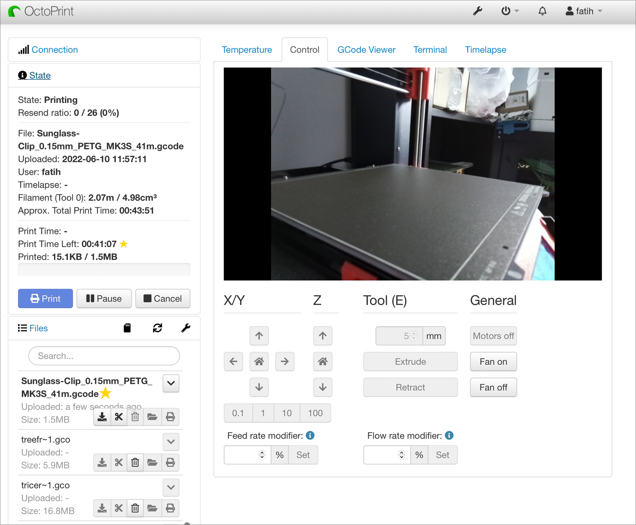 This feeling of having a machine that you can use to improve itself is something I never experienced before. Once I've installed OctoPrint and configured it, I could remotely print gcode files, and all I had was to upload the gcode files to the printer. That was nice; I no longer had to go forth and back.
