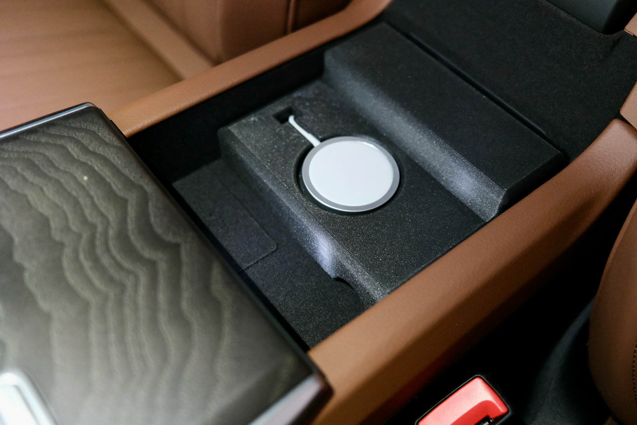 - The charging station would perfectly fit; however, because the center console is not that deep, I also lost quite a bit of space. I could use the area underneath the MagSafe charger, which was a hollow space.