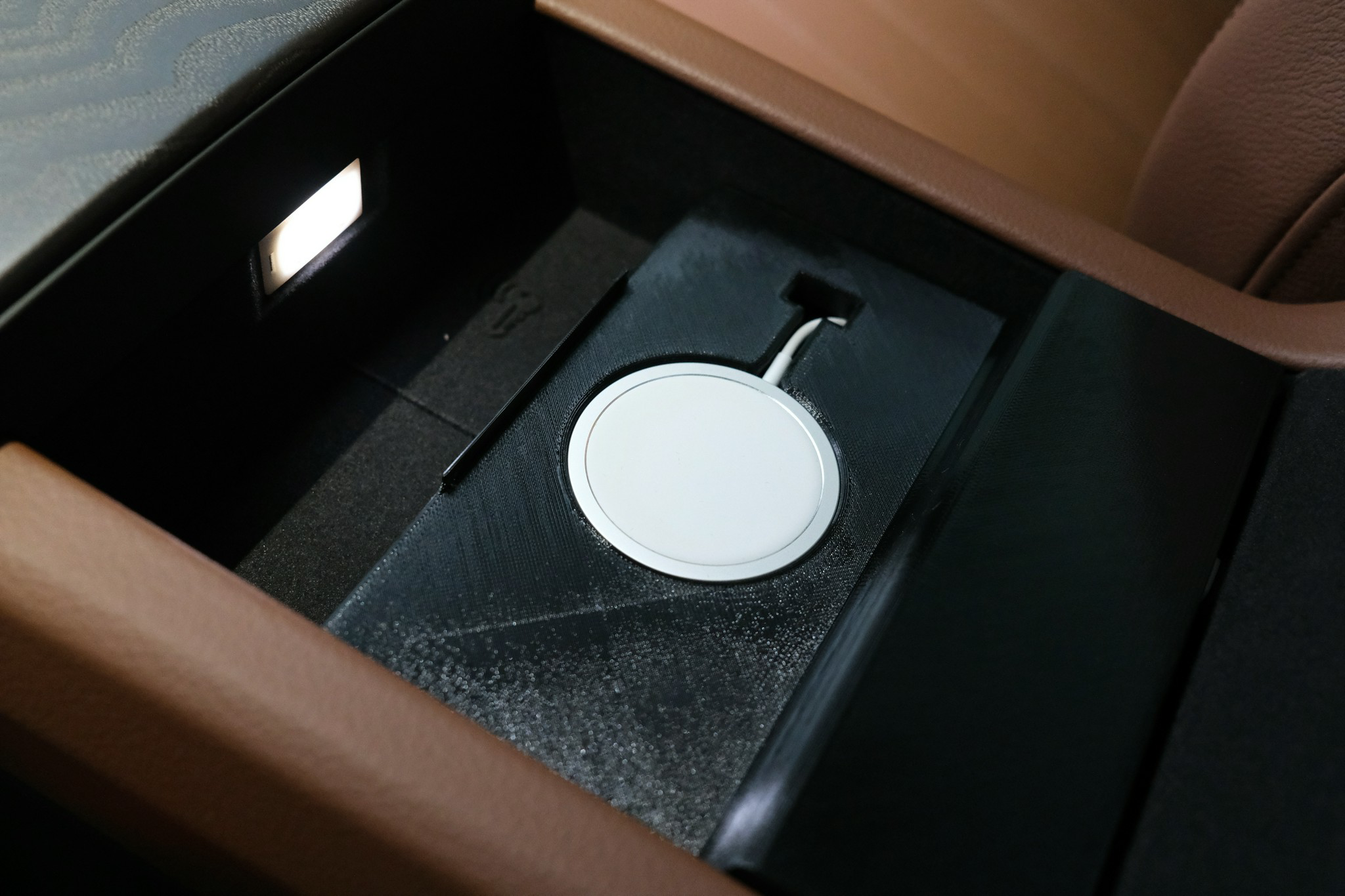 The first iteration was pretty basic. A diagonal block with a place to insert a MagSafe Charger pad. It wasn't pretty, but I thought I wouldn't need such a thing. After printing, it tried to put it inside the center console.