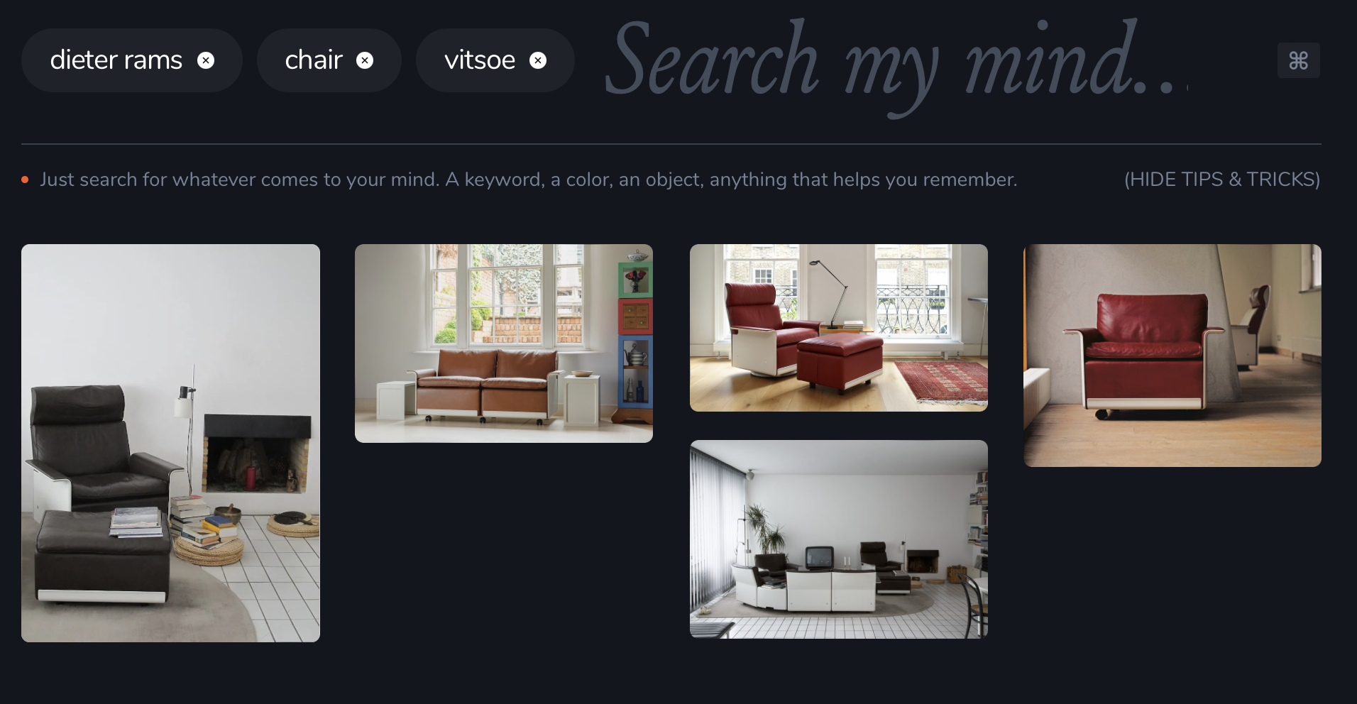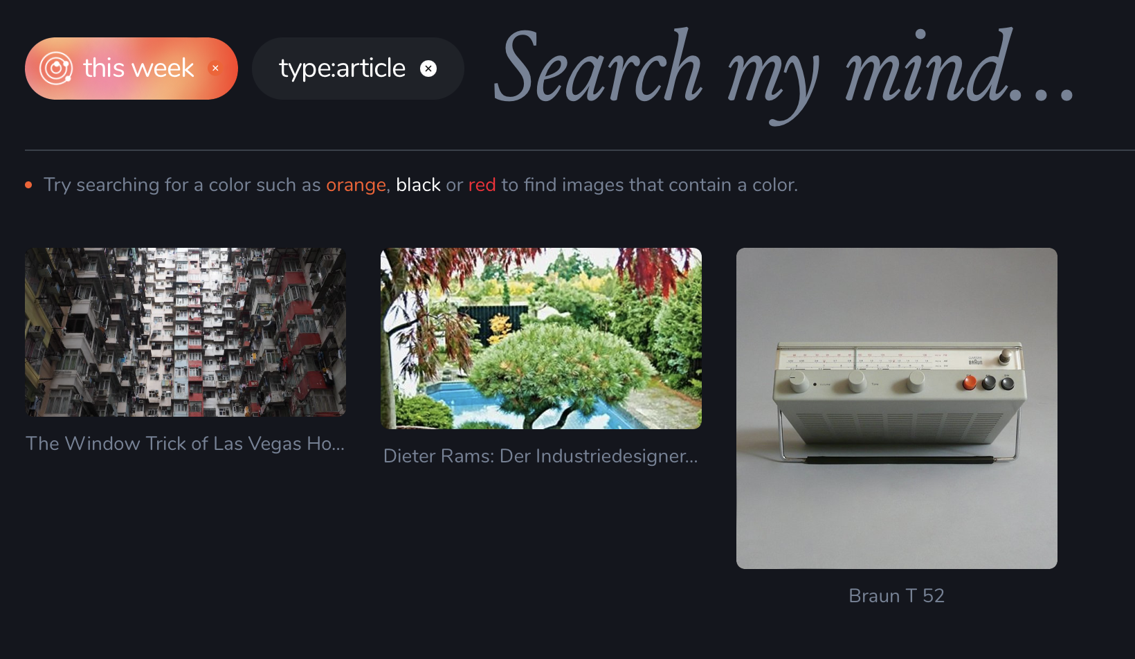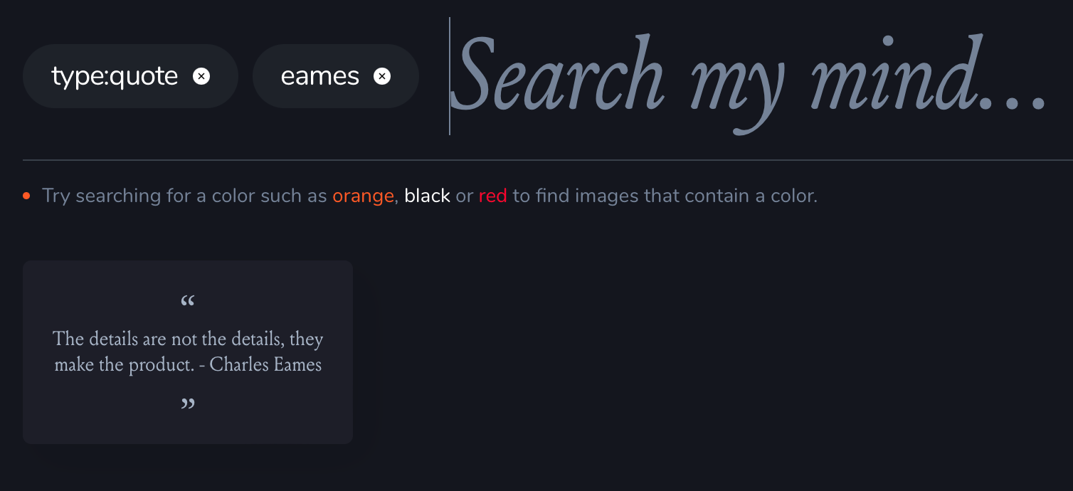 When you start searching for things, you need to type what comes to your mind. It’s so easy and straightforward, but at the same time, it’s powerful. Here are some examples from my mymind account: