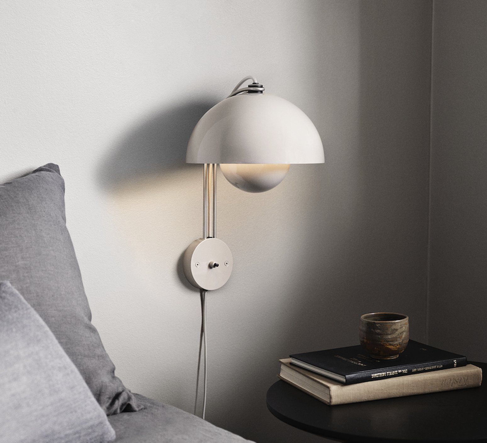 The Flowerpot lamps are a family of lamps designed by the famous Scandinavian designer Verner Panton. The light was designed in 1968 and came in various forms (desk, wall, pendant, table, etc.). This particular lamp model is the VP8. The Flowerpot is most famous for its VP3 model (table lamp), but the wall lamp is also designed well. It comes in different colors, the cable can be cut for seamless integration, and it costs around $300.
