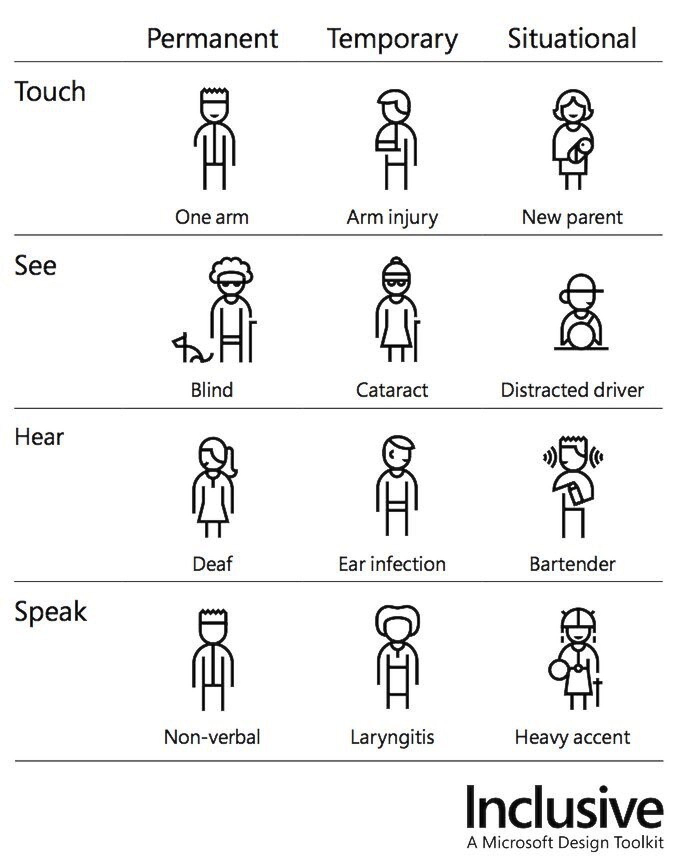 I’ve seen this table many times, and I find it very inspiring every time I see it. It’s hard to empathize with people who have disabilities, and when we design things, we make it easy for some people but difficult for everyone else. Creating with accessibility in mind will always benefit everyone, not just people who have permanent disabilities.