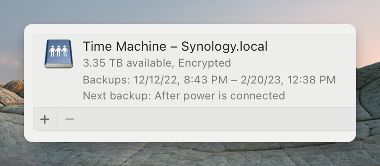 From there, I set up TimeMachine to back up my whole disk to a Synology NAS with two 8 TB disks setup with Raid 1. That’s my local backup. I configured a virtual disk that slices around 4 TB for TimeMachine and assigned a custom user.