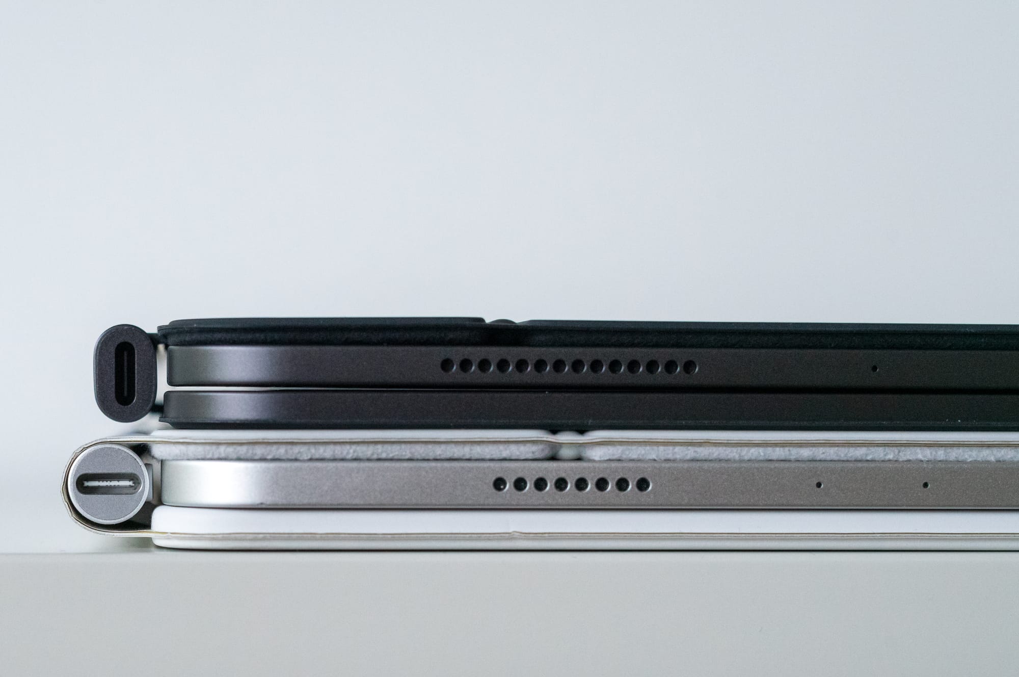 The port on the Magic Keyboard looks to be rotated 90 degrees. However, if you open them both, they change and are perpendicular to the keyboard keys afterward. Another difference is the number of holes for the speaker and mic. The new iPad has more holes for the speaker but one less for the microphone.