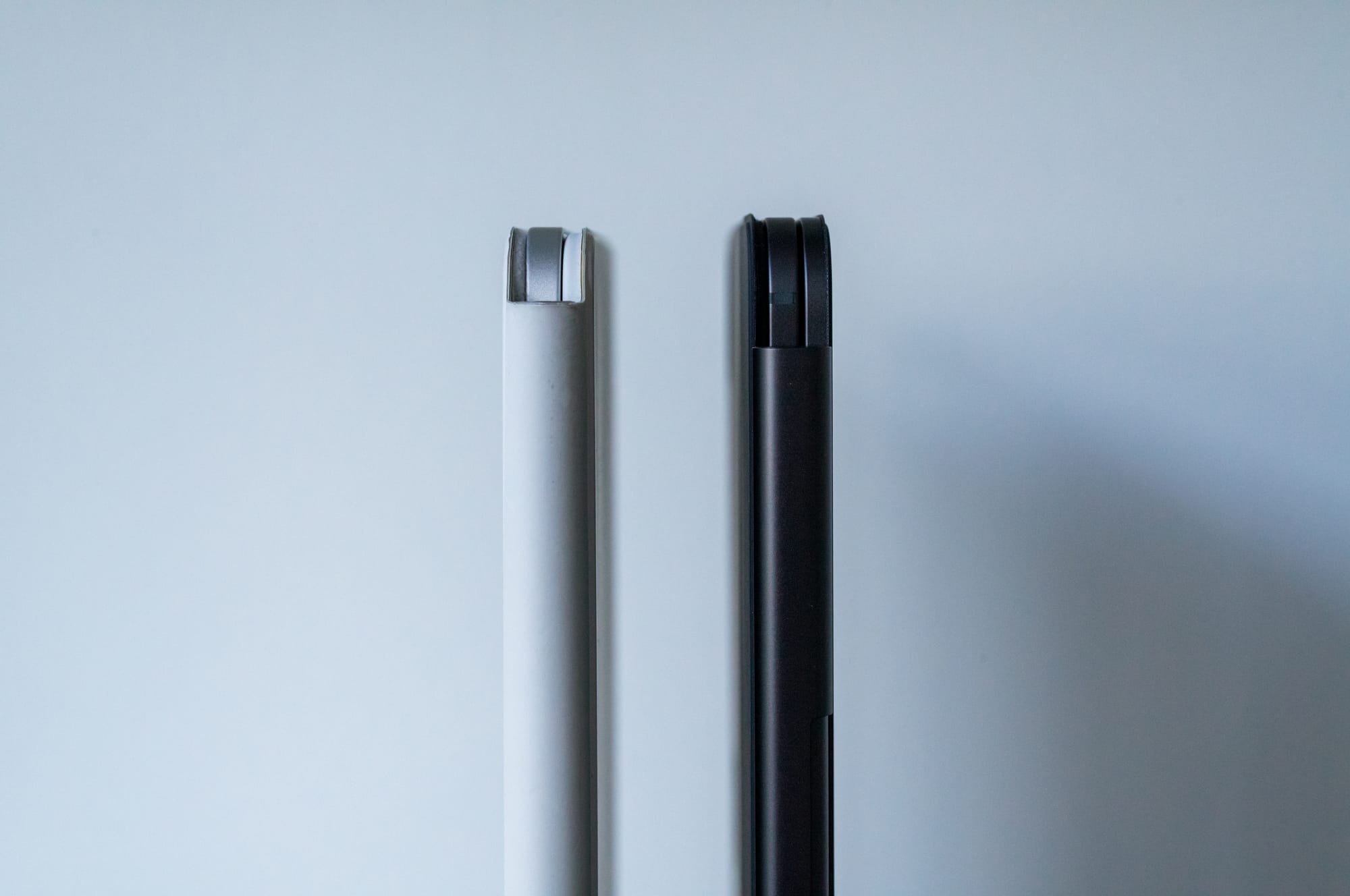 Another obvious difference is the hinge length. In the previous generation, it was longer, and it was a tad easier to find and plug in a cable. In the newer version, it's thicker and shorter.