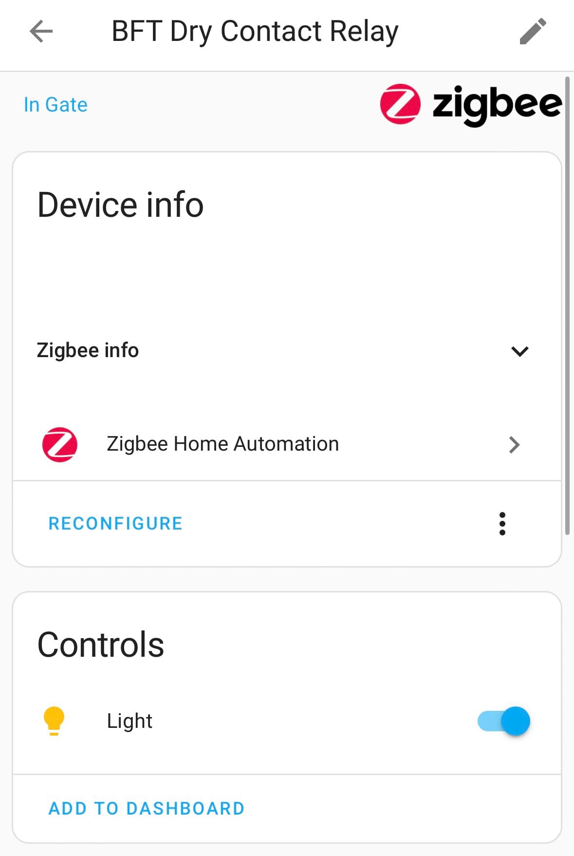 First, after adding the relay to the Zigbee hub, I discovered it was added as a light entity in Home Assistant. This means it would look like you switched a bulb when you enabled the switch via COM/NO ports.