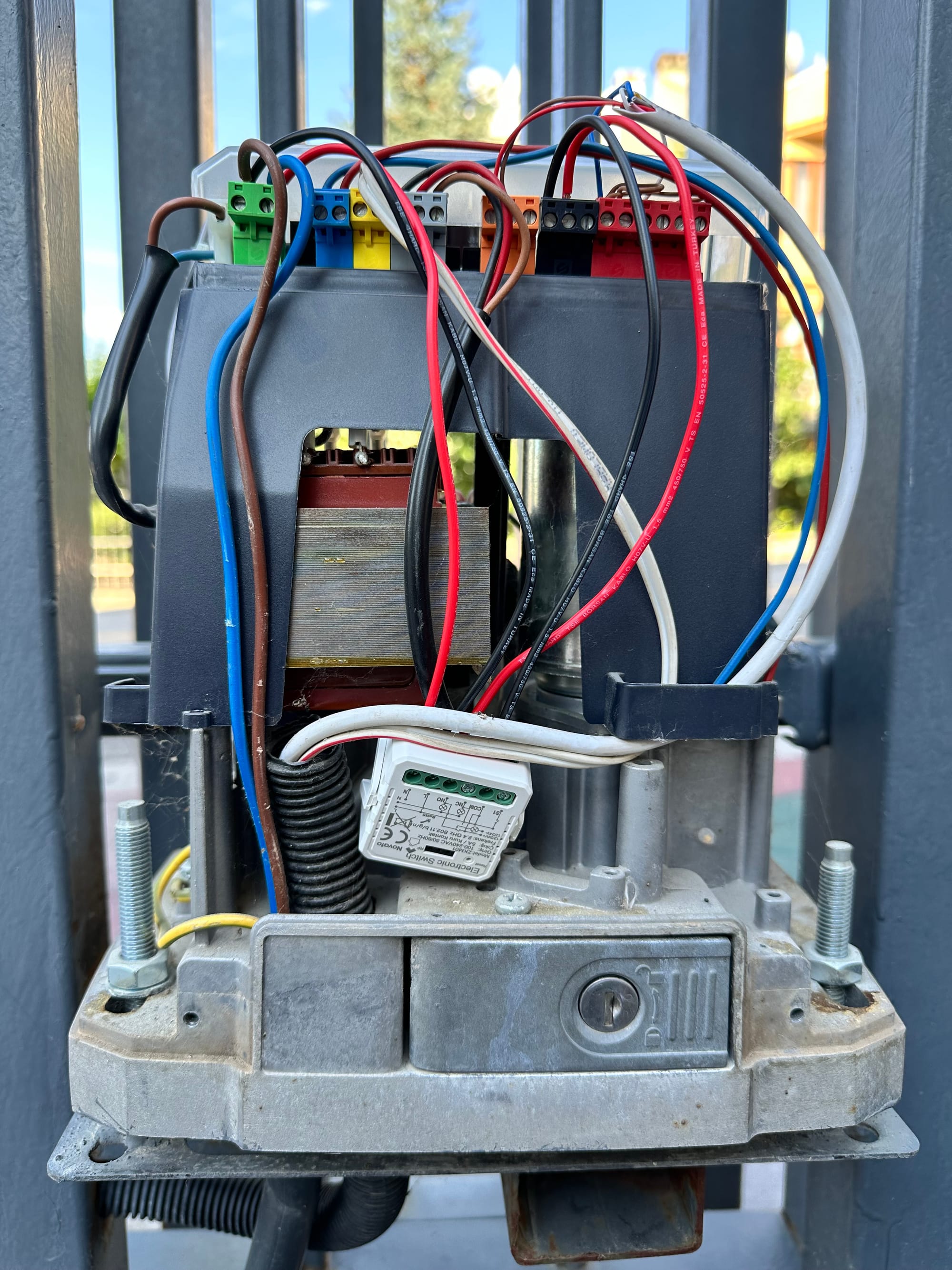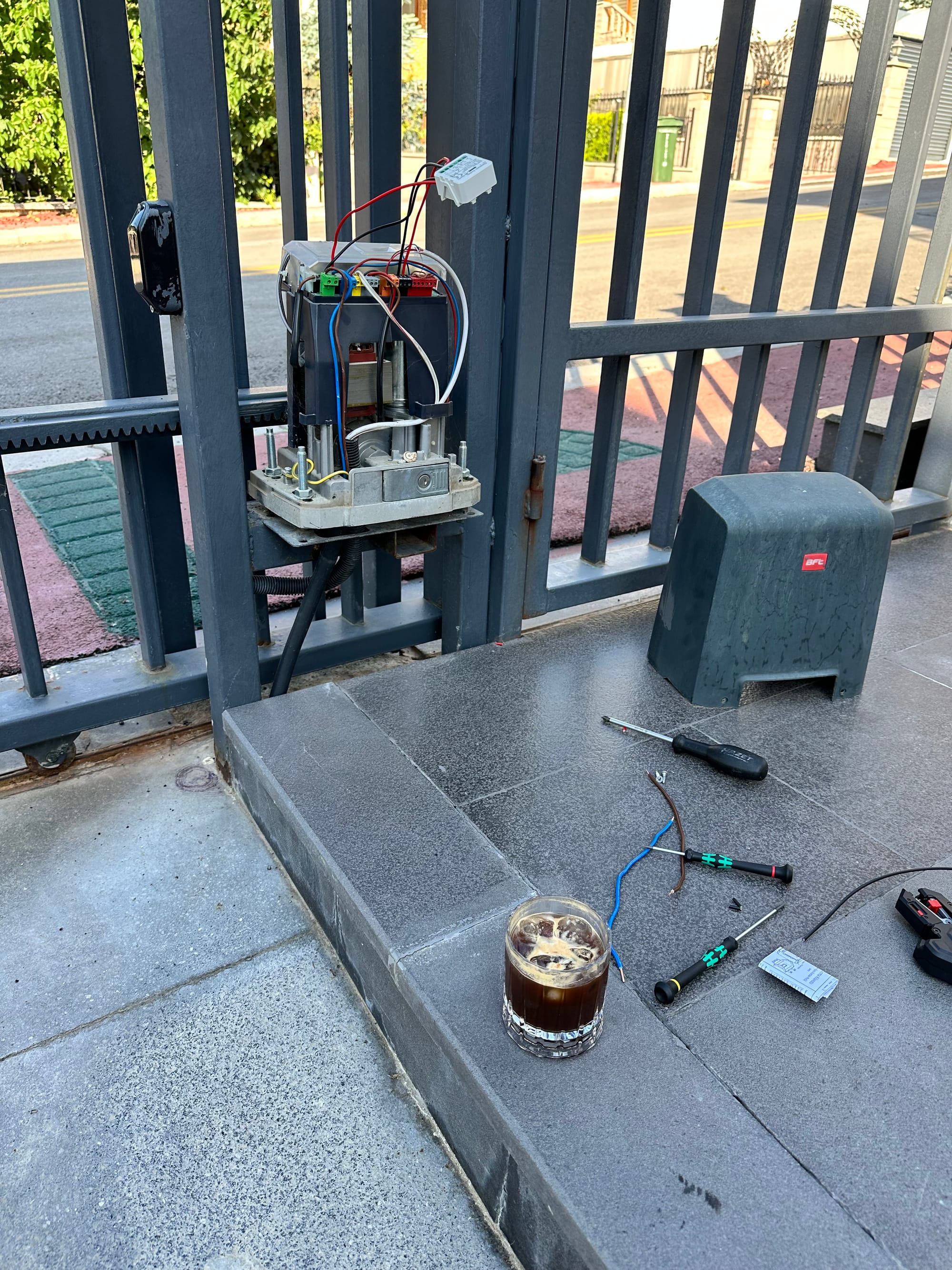 It's a sliding gate system that can carry heavy-duty doors in two ways. The motor and system are from a company called BFT, which is a very common brand here in Turkey for this kind of residential application. The gate has no physical switches, as they wouldn't be very useful. The gate door is used when I want to park my car in my garage; hence, I need to be able to open it remotely.