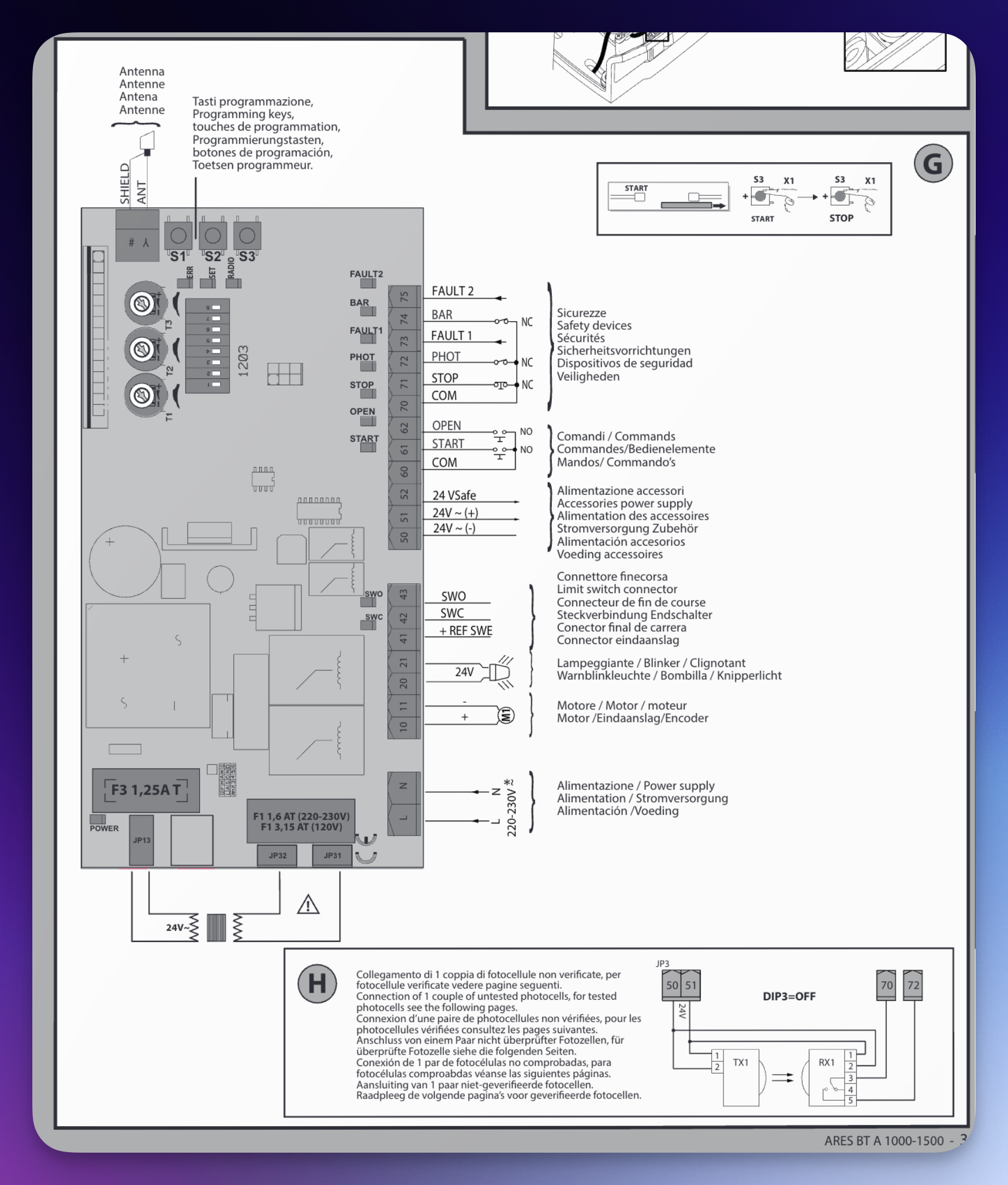 The BFT Motor I had at home used a HAMAL ARES control board, and the manual had plenty of information. The most essential ports were the 60/61 ports and the L/N (220V power supply). If the gate was short-circuited via the 60/61 ports, it would open (if closed) or close (if closed) the gate.