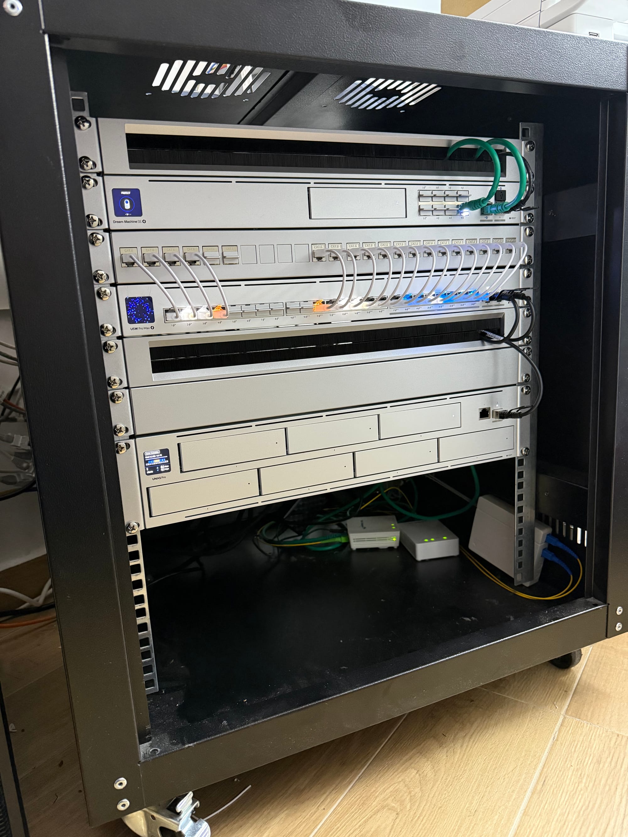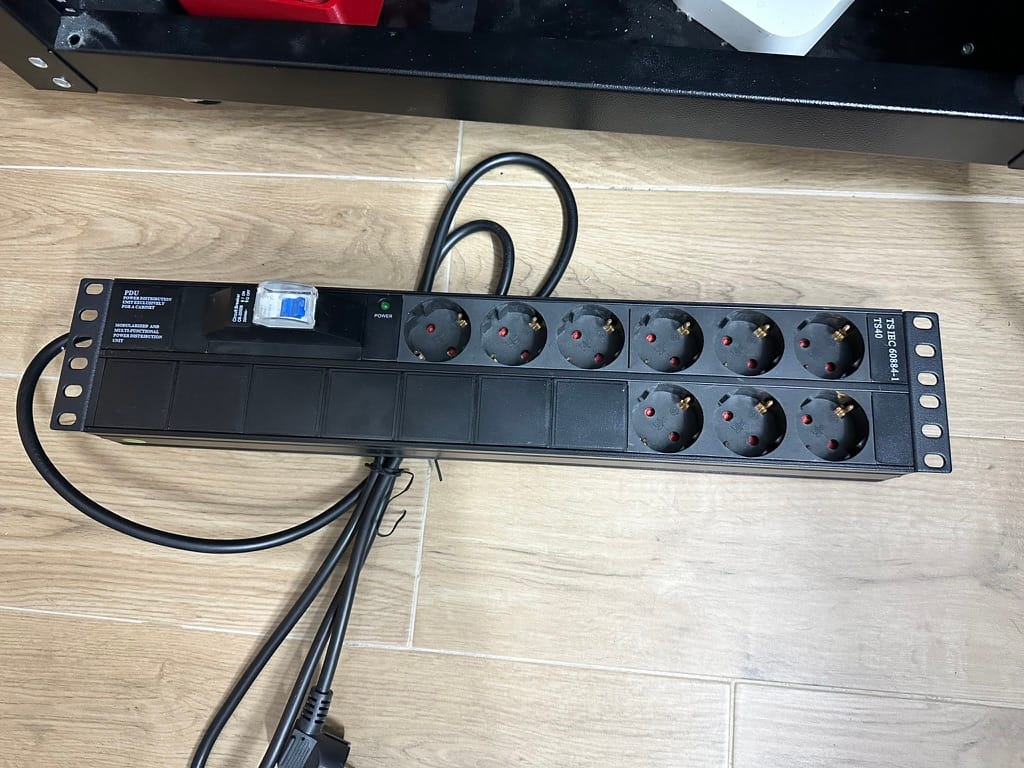 I have a 12U rack, though only half of it is being used. Because my rack has an enclosure with wheels, it's pretty useful because I have my NAS (Synology), Home Assistant Hub, PDU, and many other things at the bottom. There is a 9-port 2U, Schuko PDU, at the back. All my devices in the rack are terminated at this PDU. Then, the PDU is plugged into my UPS.