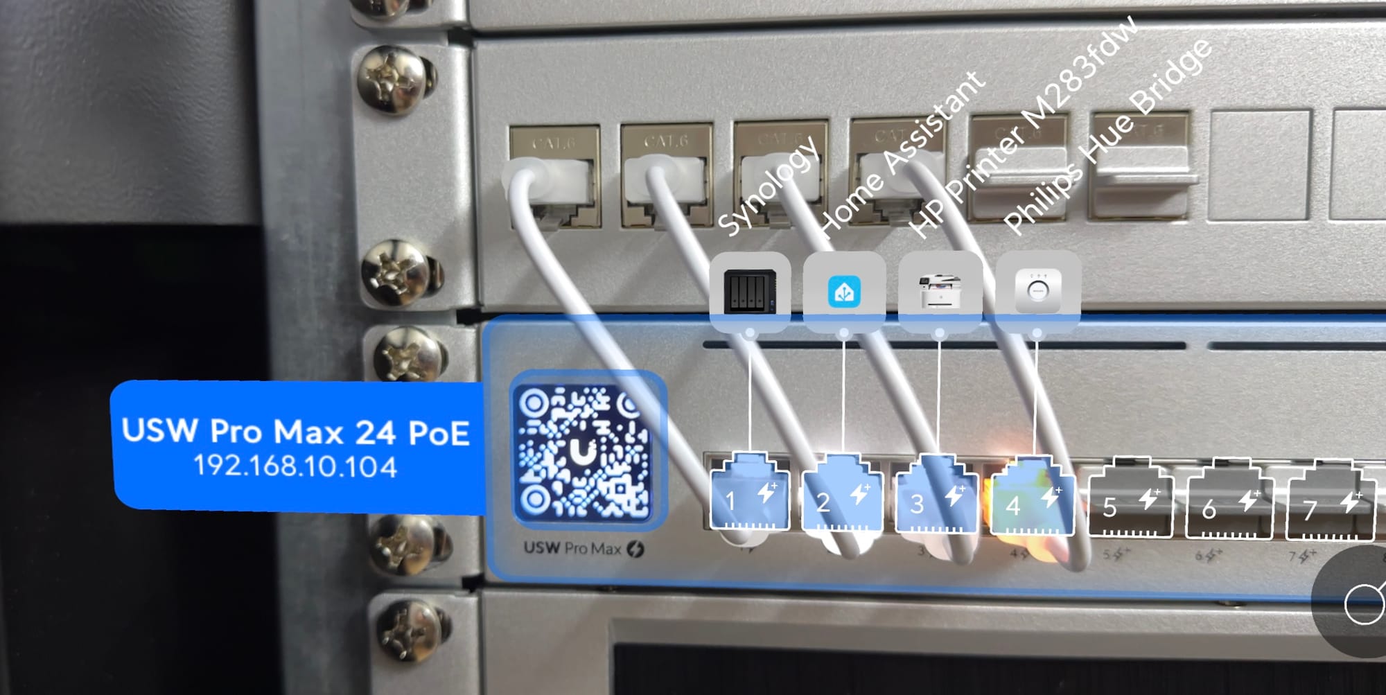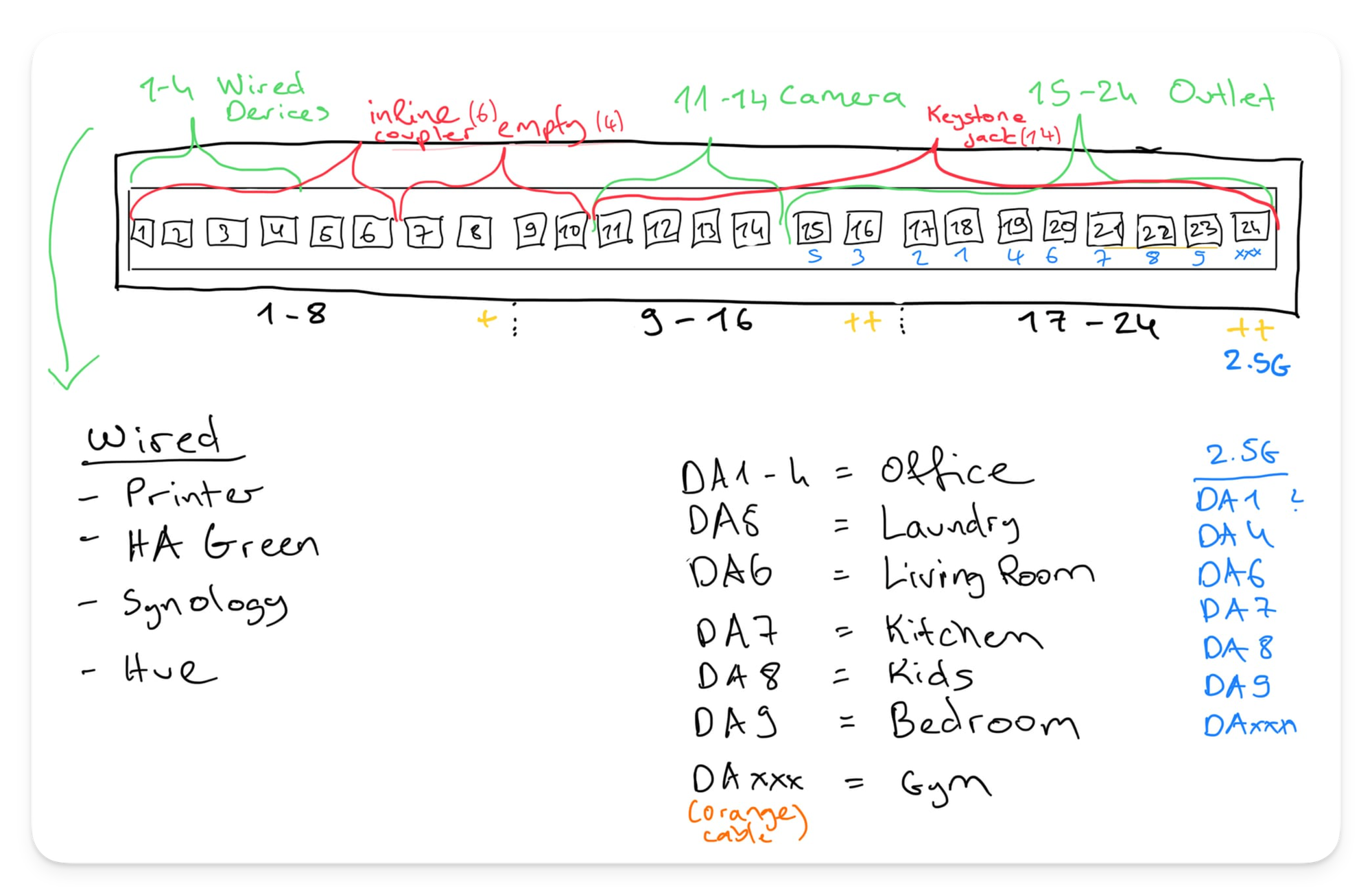 Because the Pro Max 24 PoE has different kinds of ports based on 2.5Gbe or PoE++; I had to devise a good plan to lay out the keystone jacks and assign my various APs and Cameras efficiently. Two rules were vital for me: