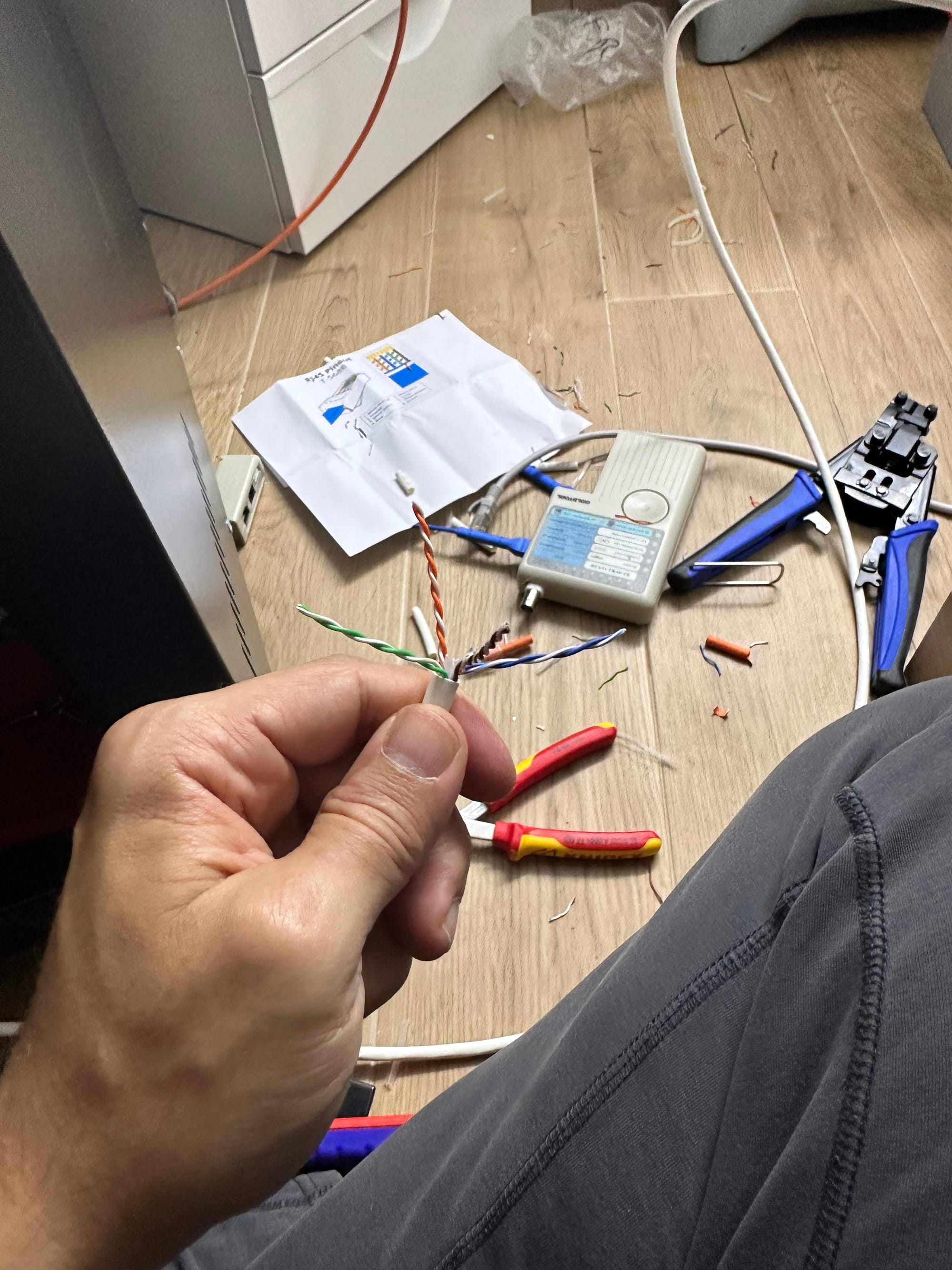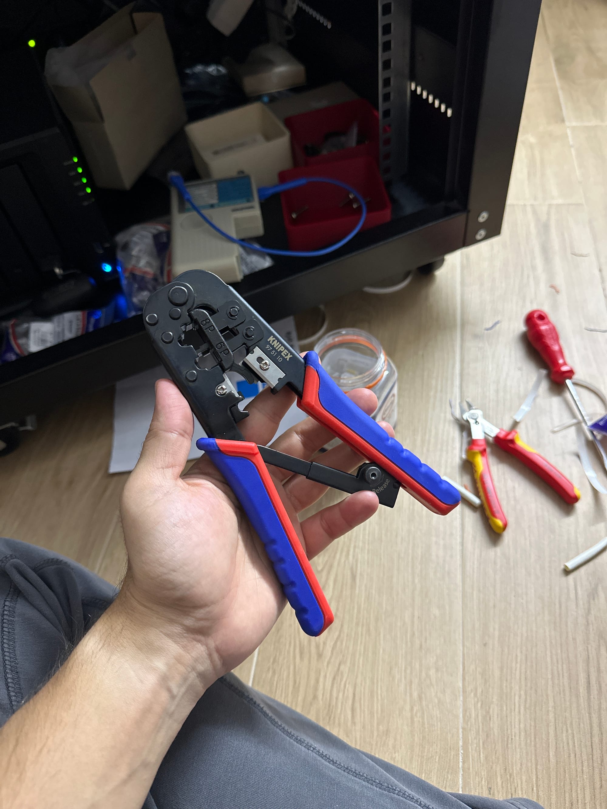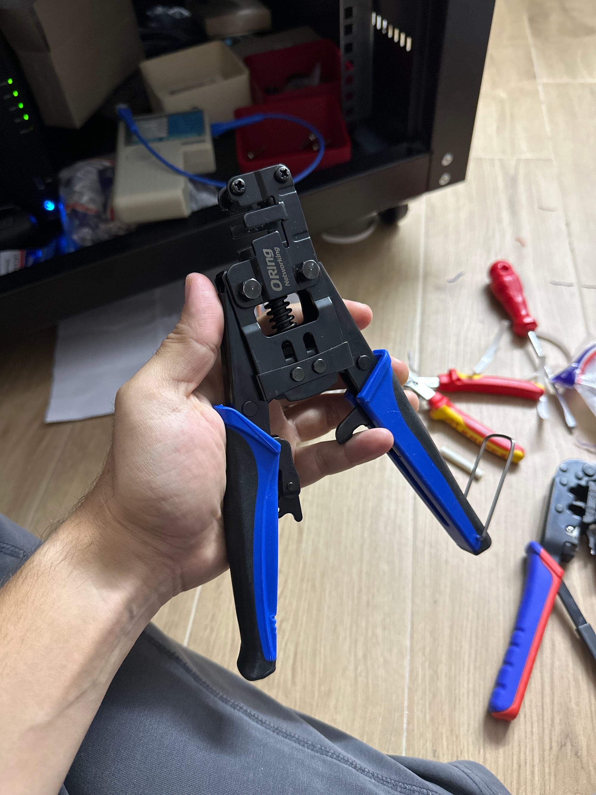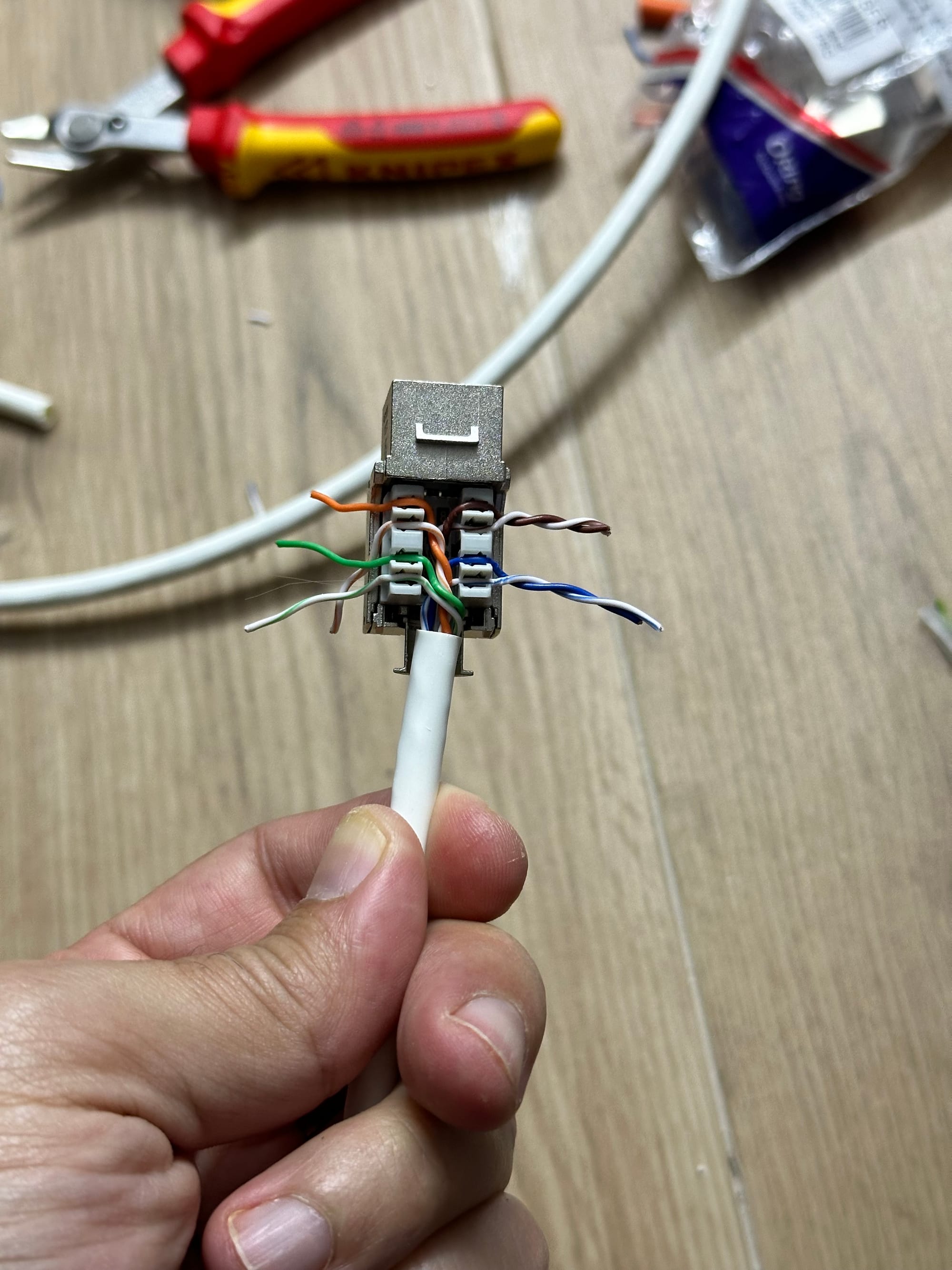 This was the most challenging part of the whole homelab project. At one end was a keystone jack (female part), and on the end was an RJ45 socket (male part). So I needed two tools—one tool for punching down cables into the Keystone jack and another one to crimp RJ45 cables.