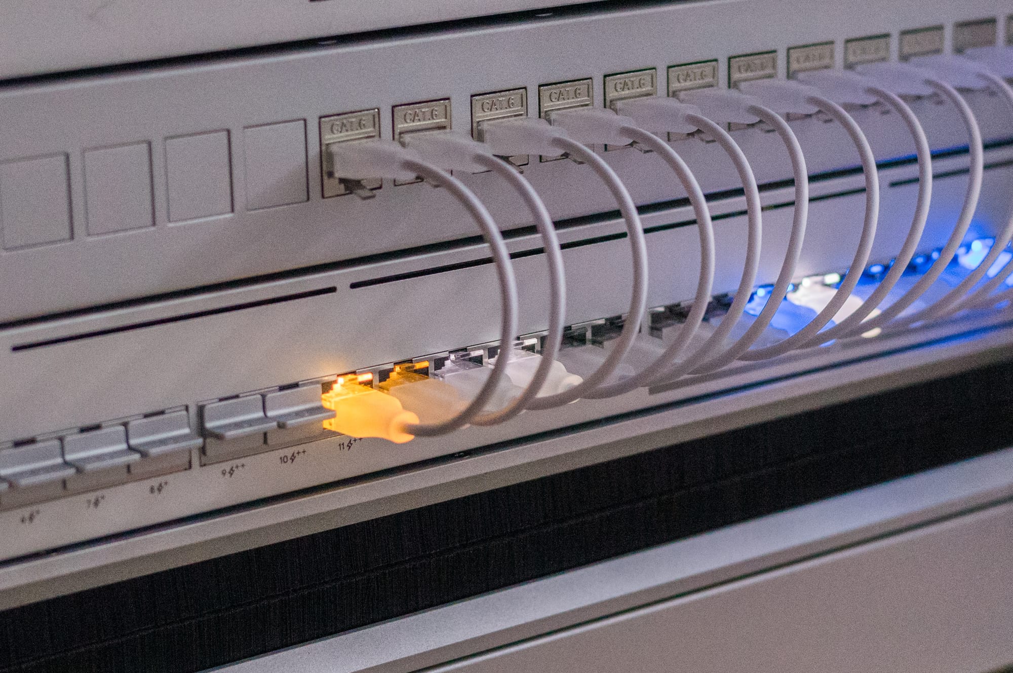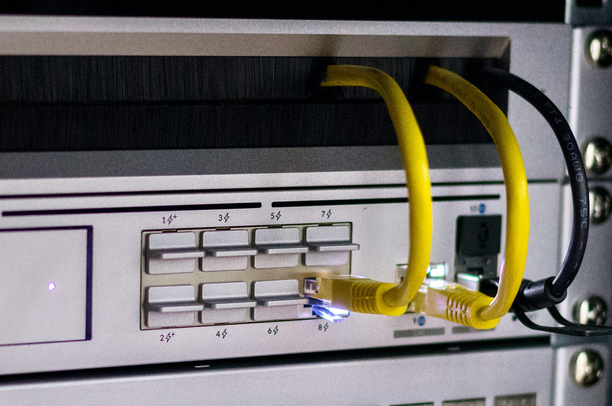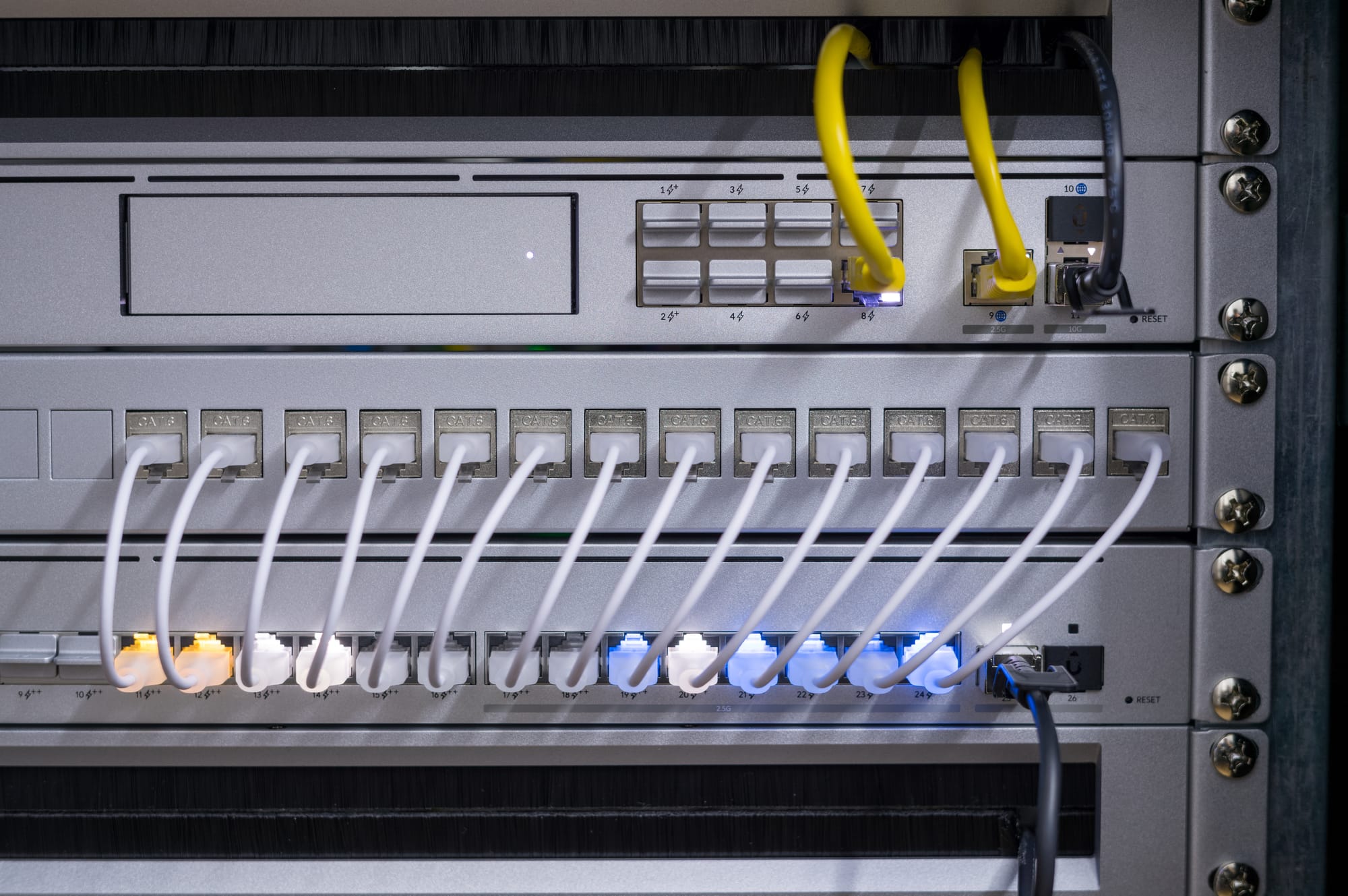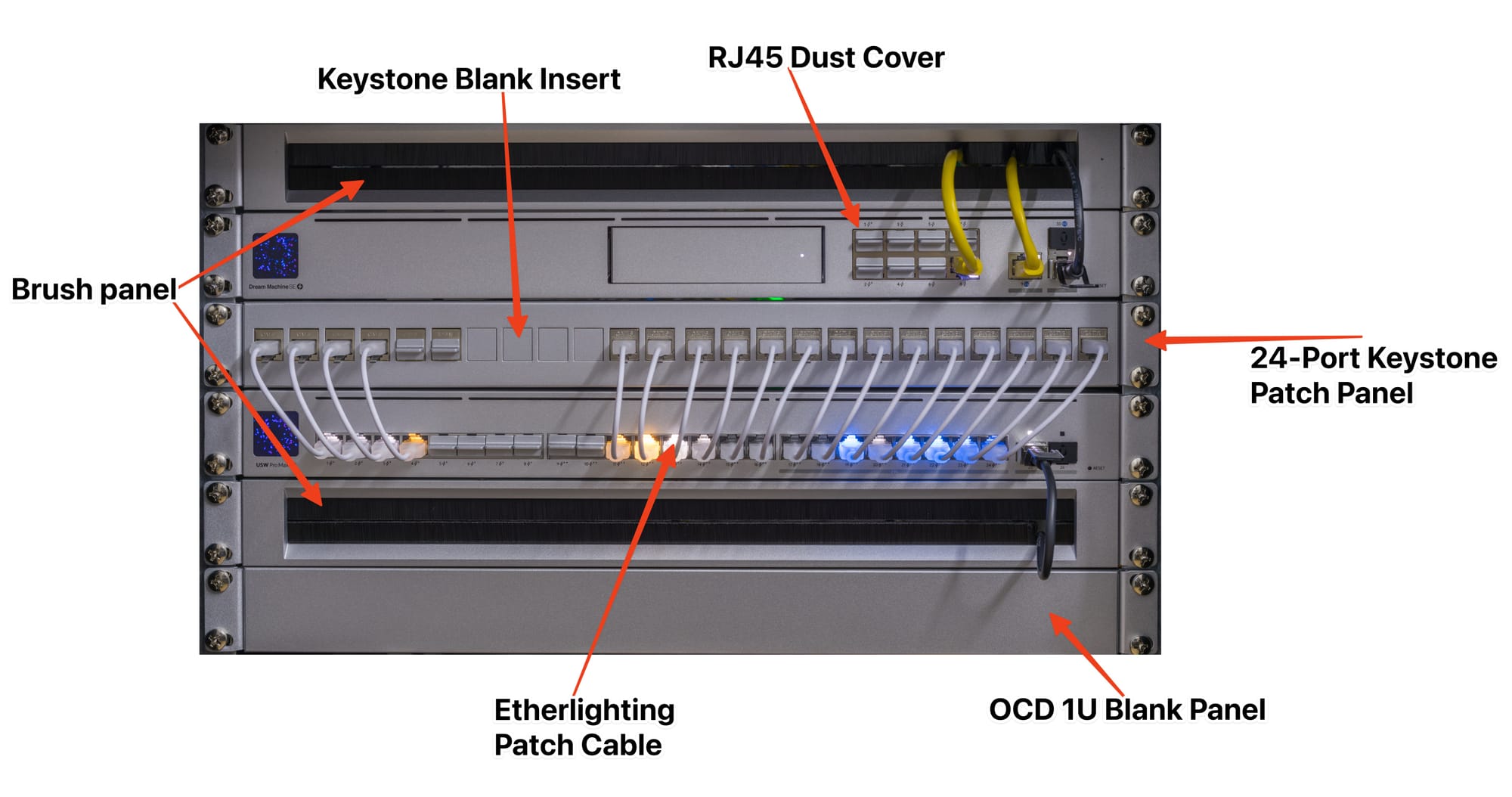 - Etherlightning Patch cables: They are used purely for aesthetic reasons. They keep the Rack tidy. However, because they are so short, they don't obstruct the ports, which has the slight advantage of improving rack maintenance.