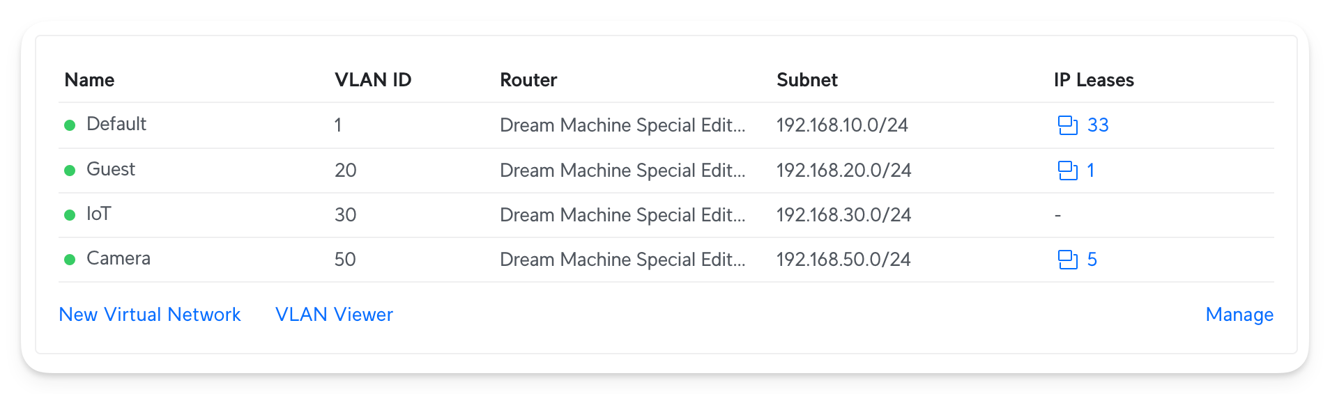 All VLANs have a dedicated subnet with around ~249 usable IPs, which is good enough for household use.
