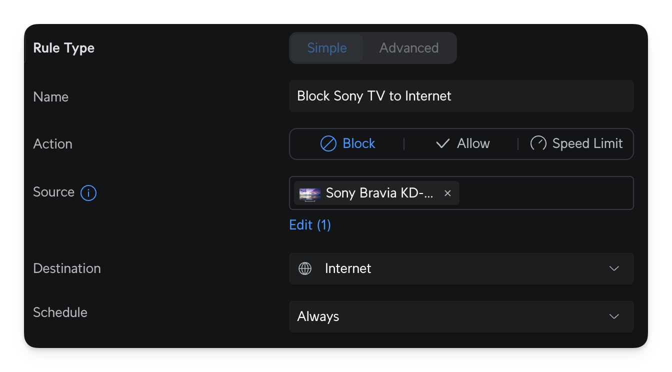 - Block specific devices to the Internet. For example, my Sony TV cannot access the internet, and I only enable it occasionally to check if there is any FW update. I use an Apple TV 4K box, which I trust more than my TV.
