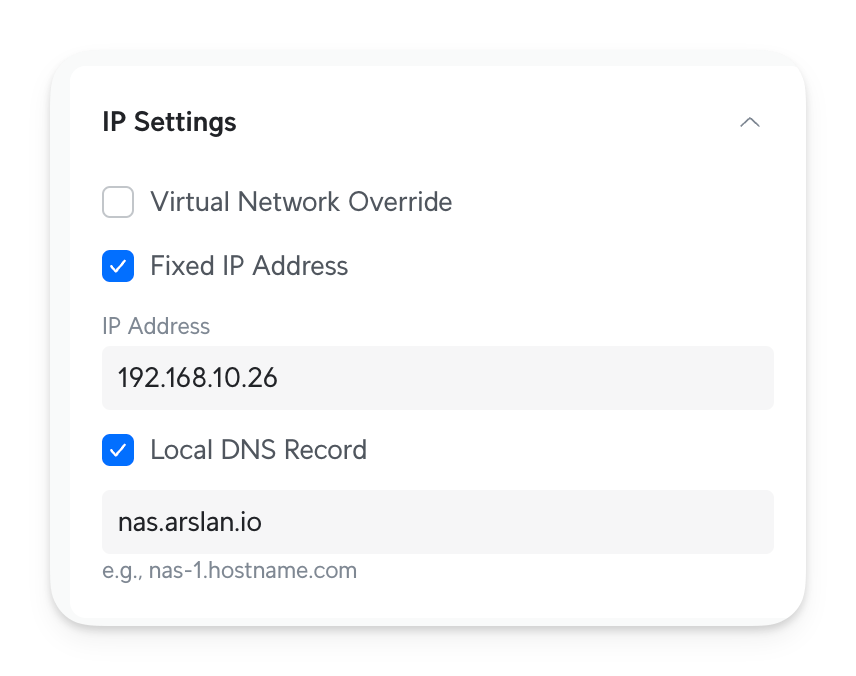 nas.arslan.io in my browser, and it'll open my NAS without having to remember the IP.This is different from setting a fixed, static IP from the device. Never do that. Instead, let your router assign the IP and fix it inside your network. After setting it up, you can verify if via dig and see that the local domain resolves to your fixed IP: