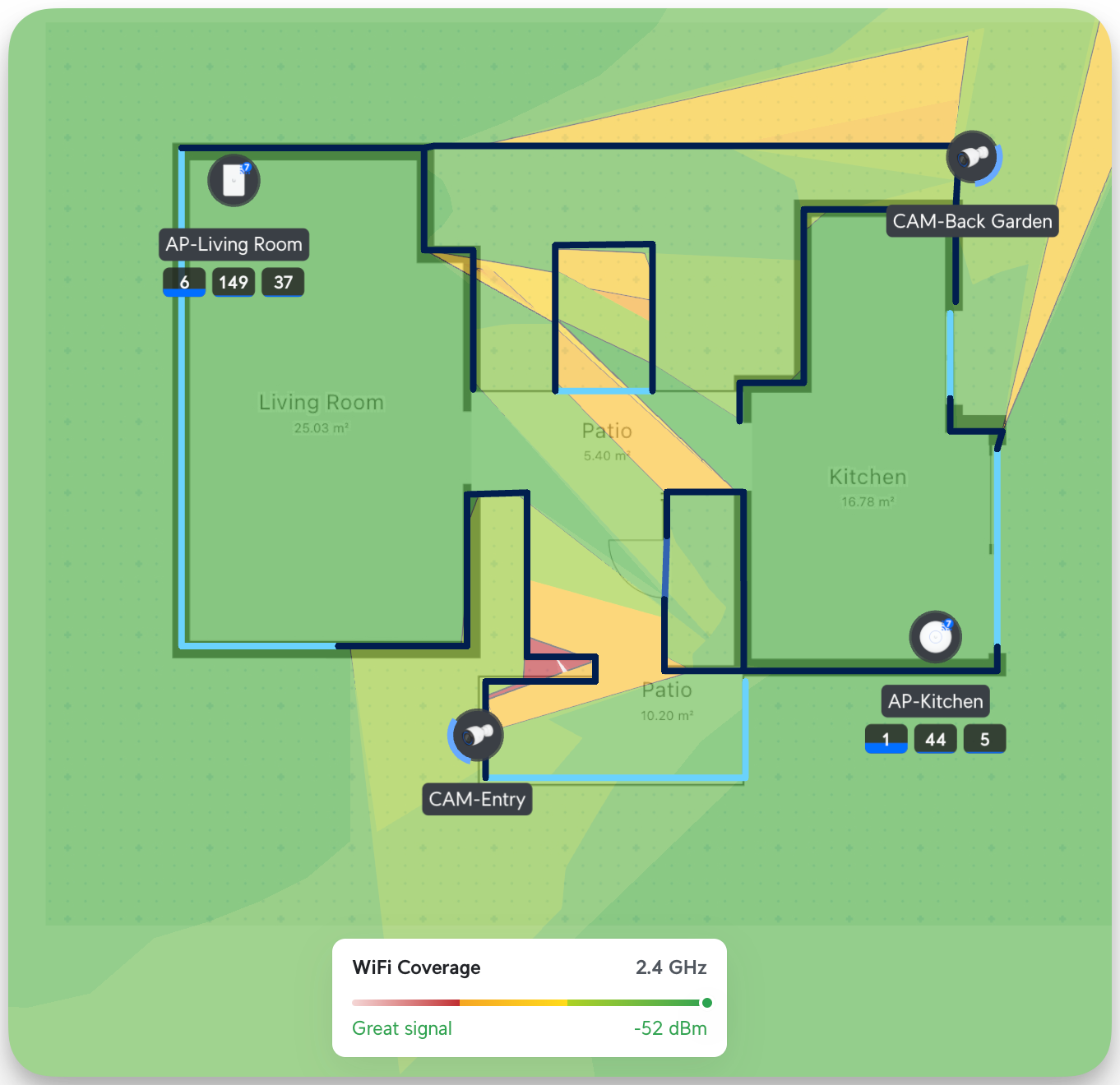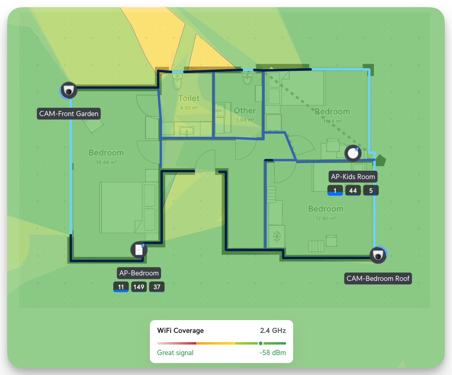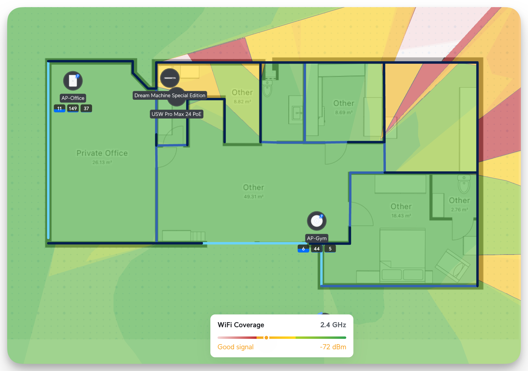 Unifi has several tools that allow you to simulate the strength of a Wi-Fi signal. You can upload your layout, draw the lines, and define the wall types (concrete, drywall, etc..). After that, you can start placing all your devices. Based on the wall type shows how much the signals propagate. Here, you can see that in 2.4 GHz, it's well covered (I also optimized the Wi-Fi channels for each Band; more on this later)