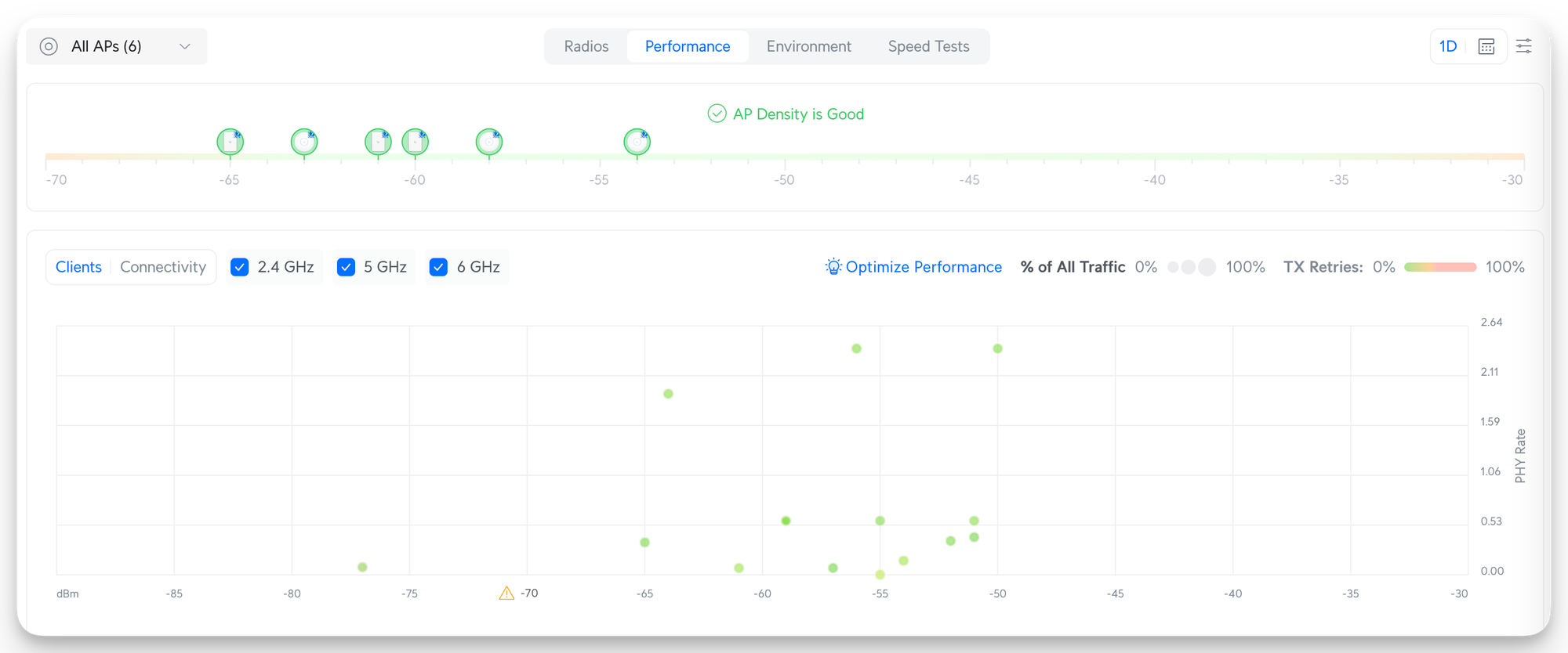 Here, you can see that right now, the AP density is in excellent condition, and clients have a good signal to the various APs: