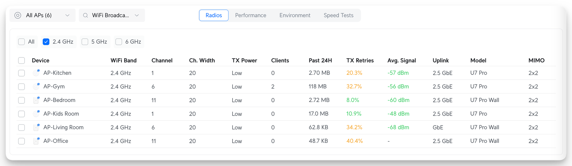 Finally, I've changed the TX power to be Low for every single AP. This immensely helps clients to drop when they go to another room or switch floors. The biggest problem with the 2.4 GHz band is that it's like a parasite and very good at passing through a lot of walls. Hence, it also causes a lot of interference. By changing it to Low, we're not only a good citizen in our neighborhood, we also get the optimal environment for clients that use the 2.4 GHz band.