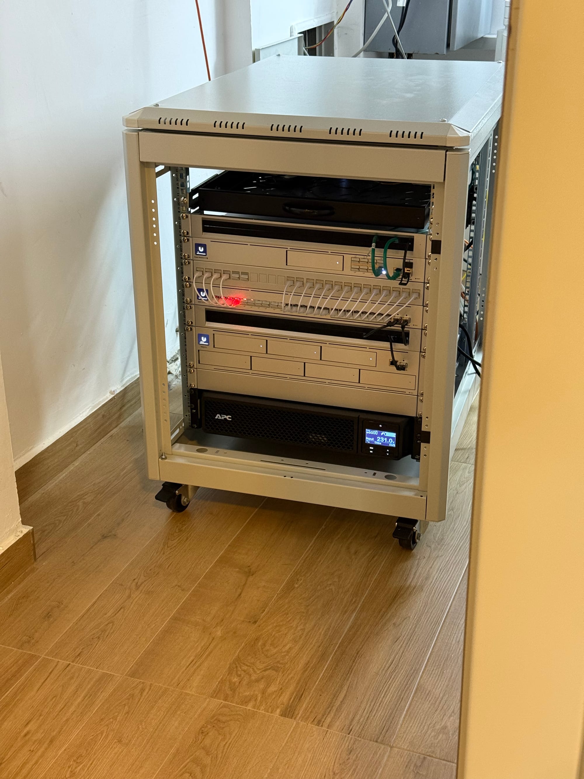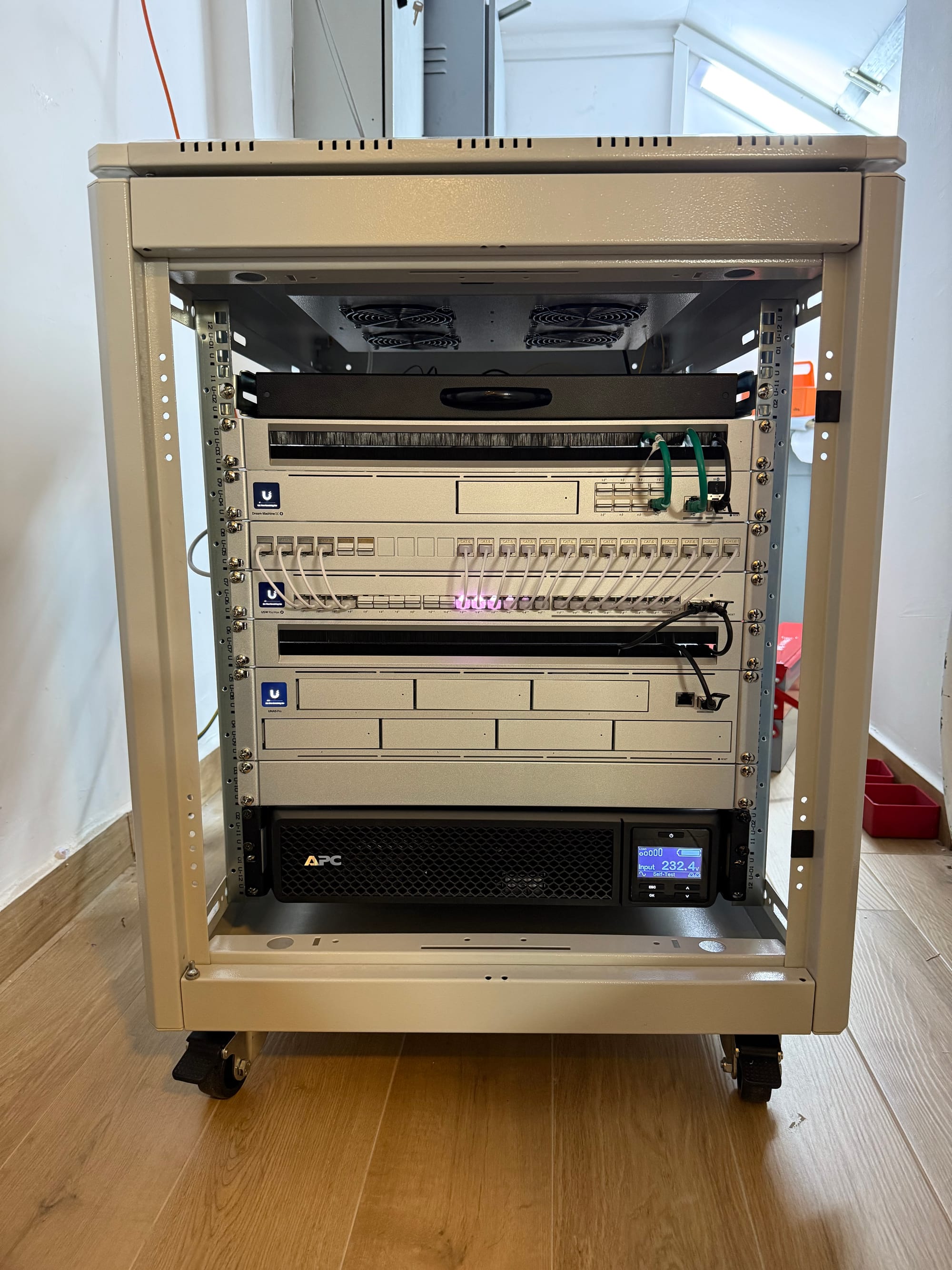 A 3kVA UPS tower powers all the devices in the Rack (including the NAS and various hubs). However, I bought the UPS 3.5 years ago, and it's unfortunately dying. I must replace the battery; however, I'm also considering purchasing a rack-mounted UPS from APC.