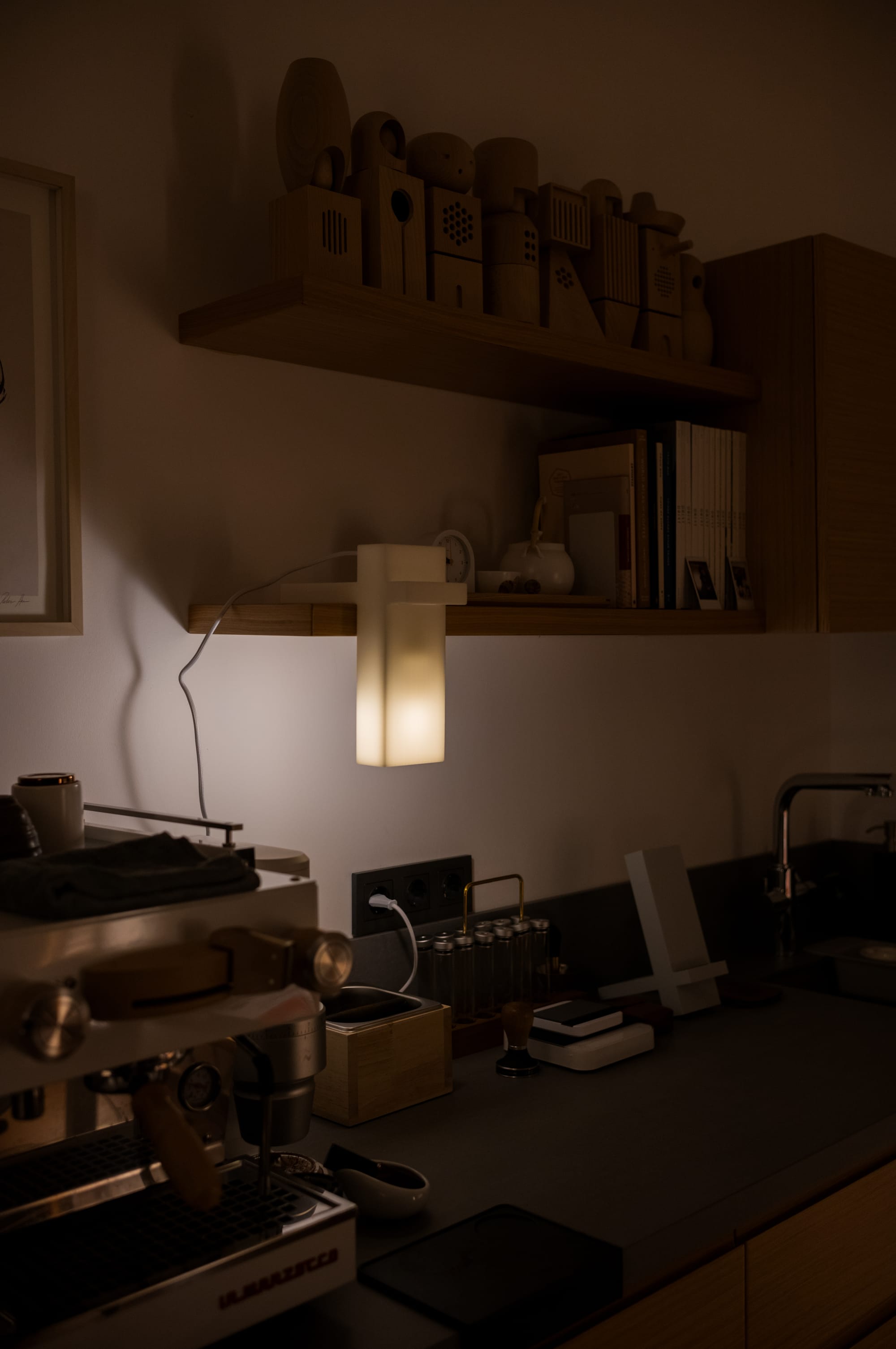 My espresso bar has two shelves, which is the only poorly lit area in my office room. So, I had to design something versatile that could be used in multiple ways: