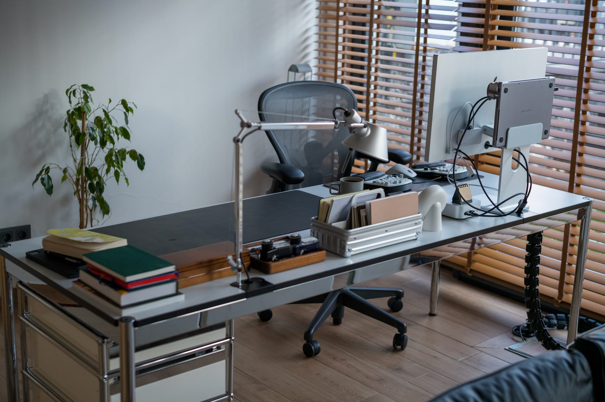I did not want to maintain two separate desks in the same room, but I also did not want the computer to dominate everything. A single, long surface with two clearly defined areas turned out to be a good compromise. So I researched and ended up with the one in the pictures, which is a 200x75cm long desk from USM Haller.
