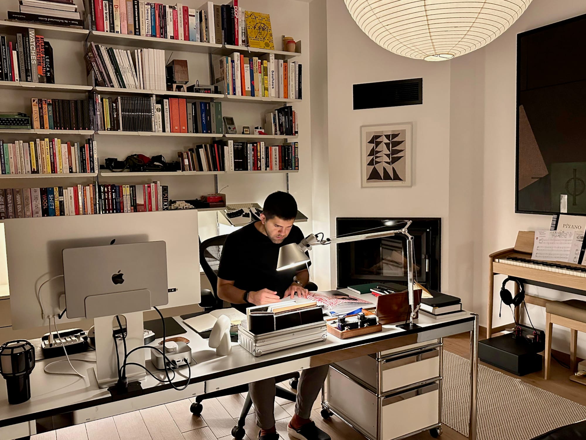 Splitting the desk into a digital and an analog side creates a clear mental boundary. And moving the chair from one side to the other is enough to change the context.