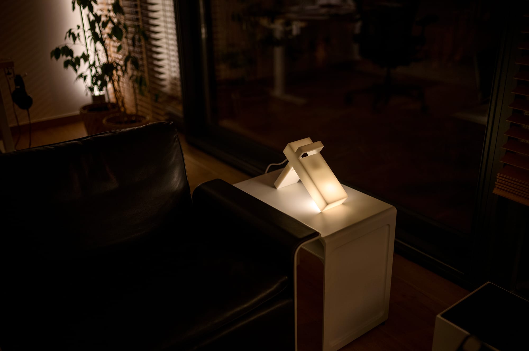A lamp that can be used in several ways. As an ambient lamp where the lights reflects against the wall or the desk. Or as a shelf lamp to light up a specific environment.